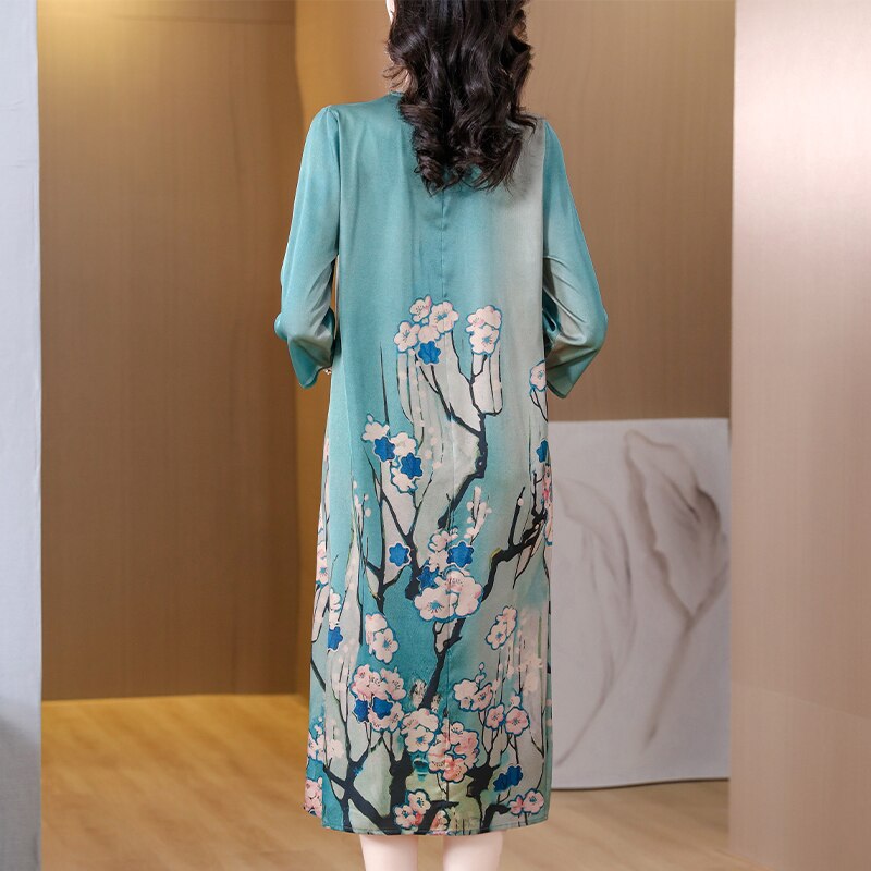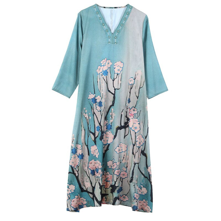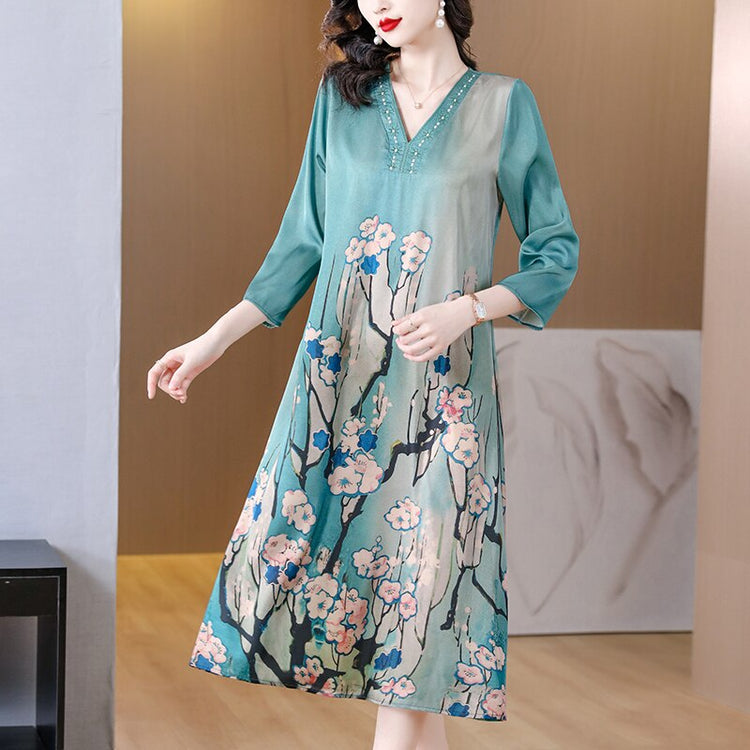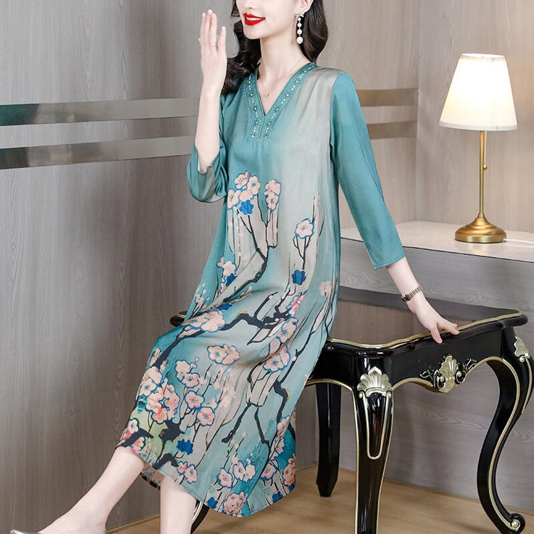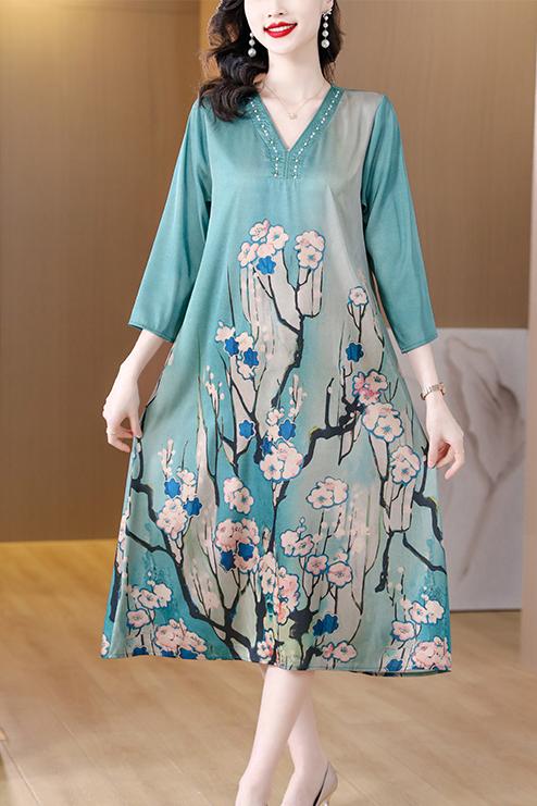 Casual Blue Silk Satin V-Neck Midi Dress Short Sleeve