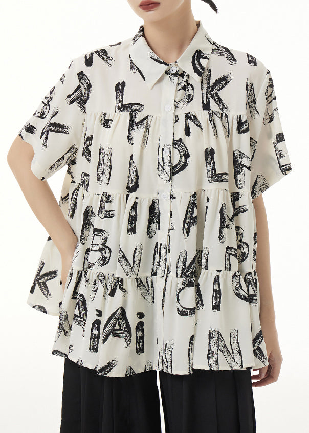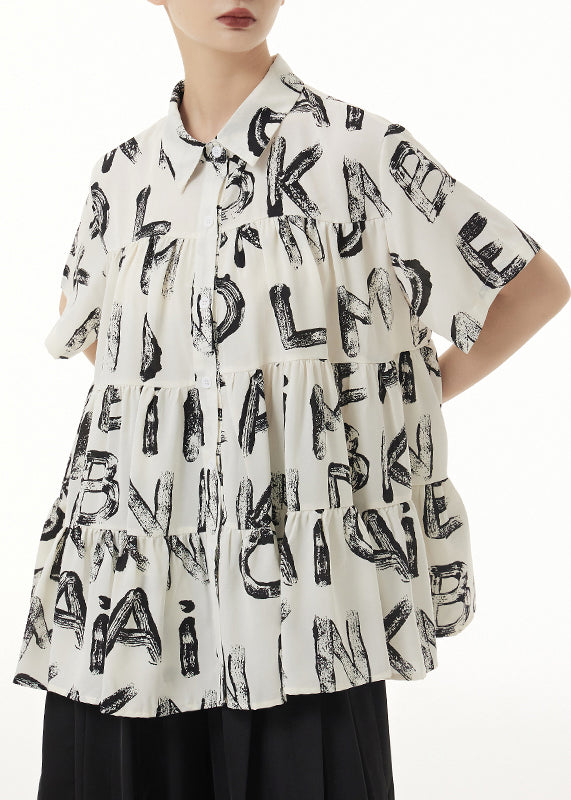 Plus Size Beige Peter Pan Collar Print Wrinkled Patchwork Silk Shirts Summer