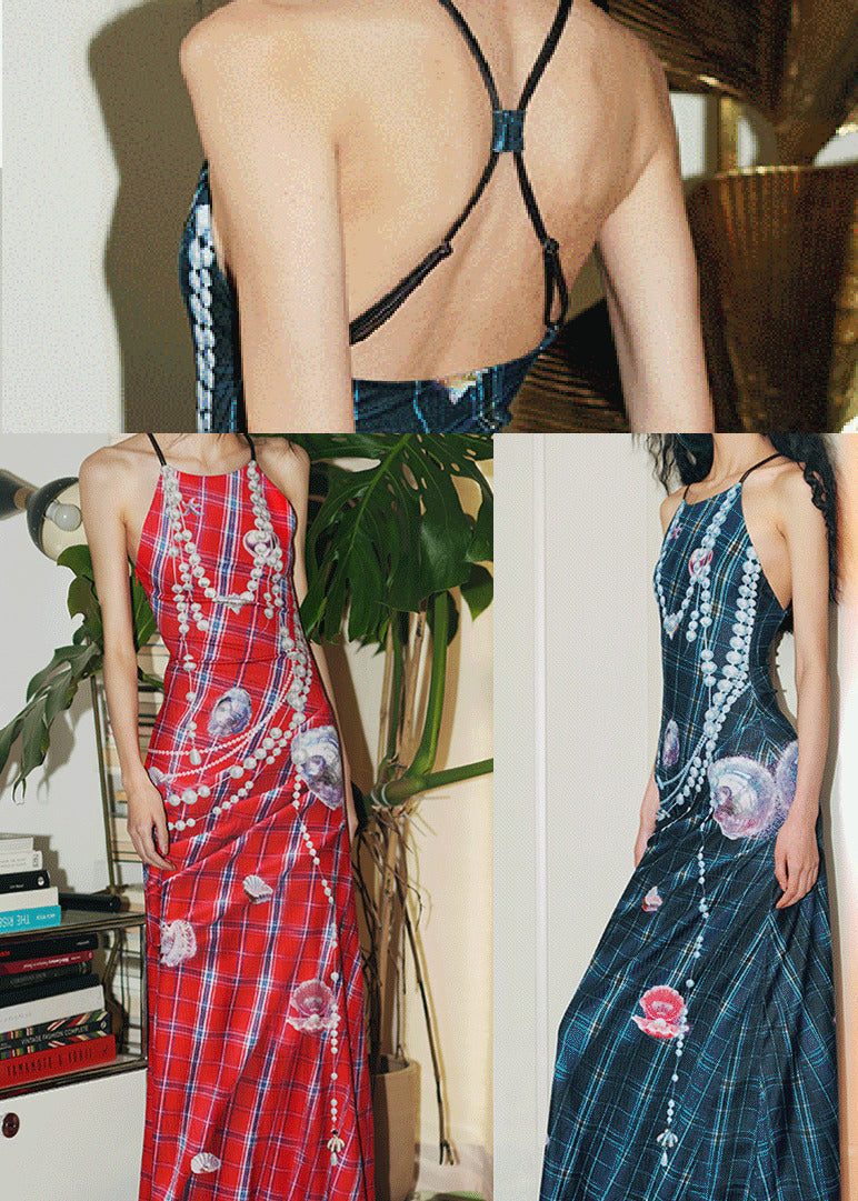 Style Navy Backless Print Silk Spaghetti Strap Dress Summer