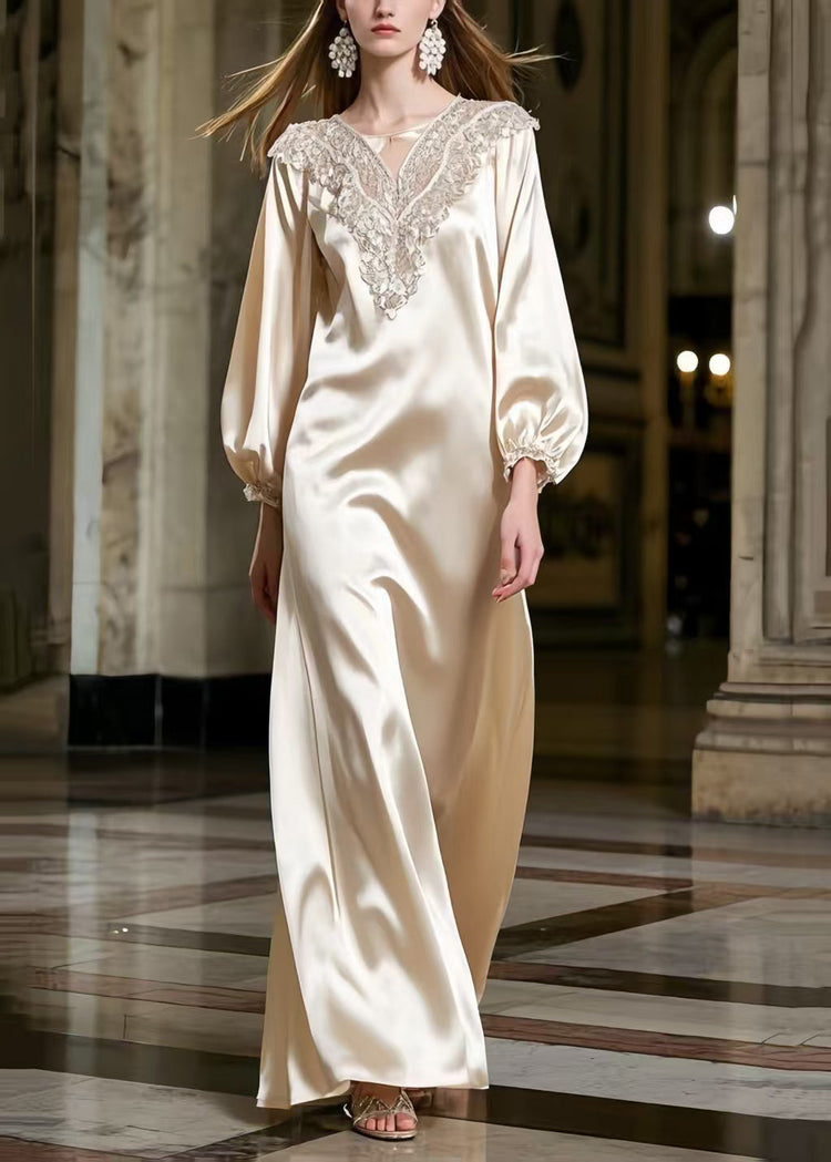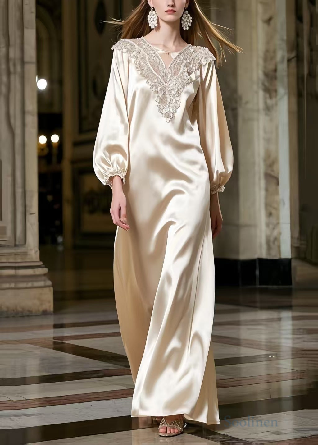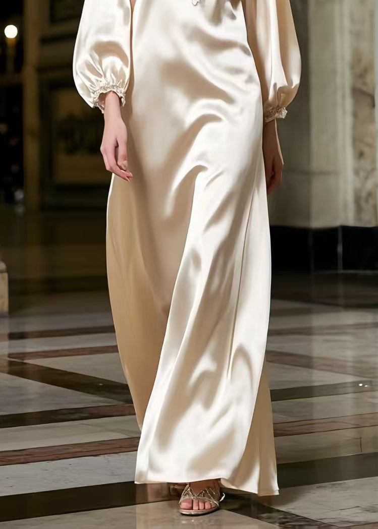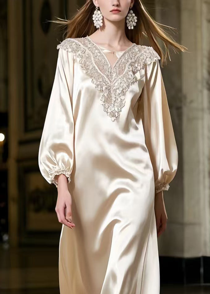 Women Champagne Lace Neck Draping Silk Robe Dresses Spring
