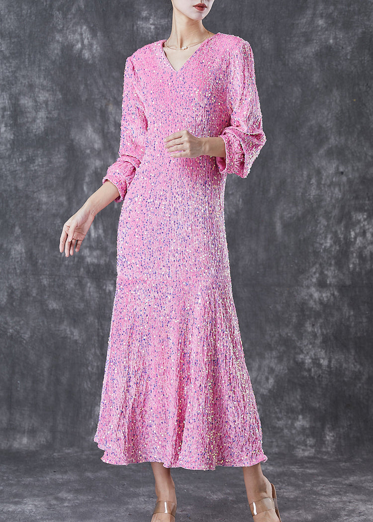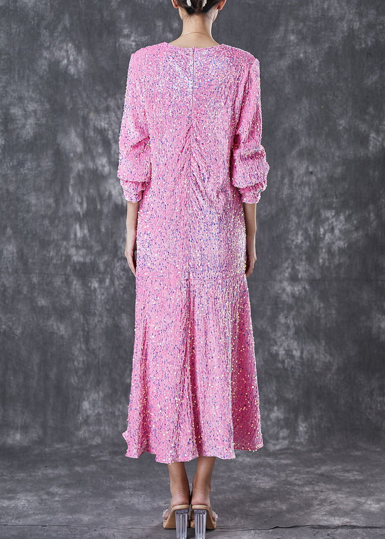 Women Pink Sequins Wrinkled Silk Velour Dress Vestidos Spring