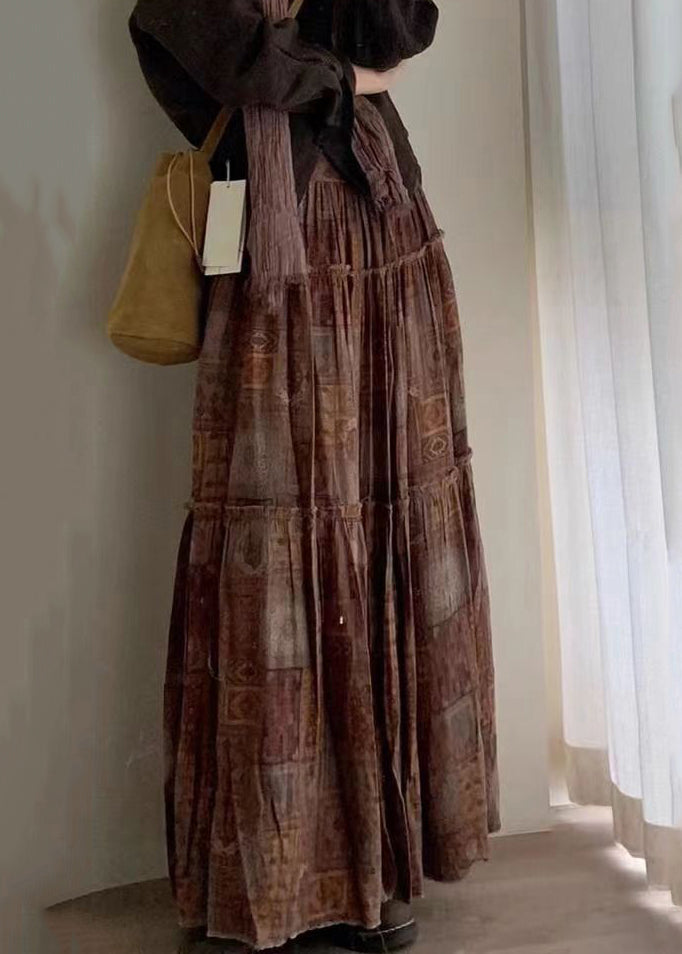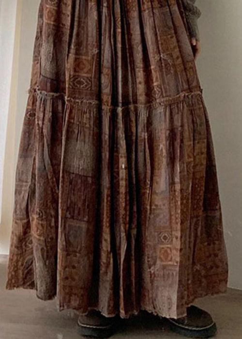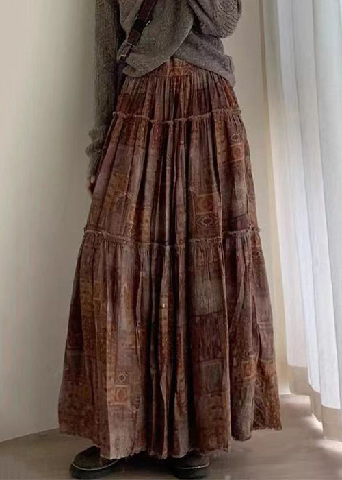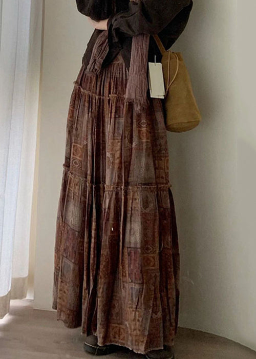 Loose Caramel Print Elastic Waist Patchwork Cotton Skirts Spring