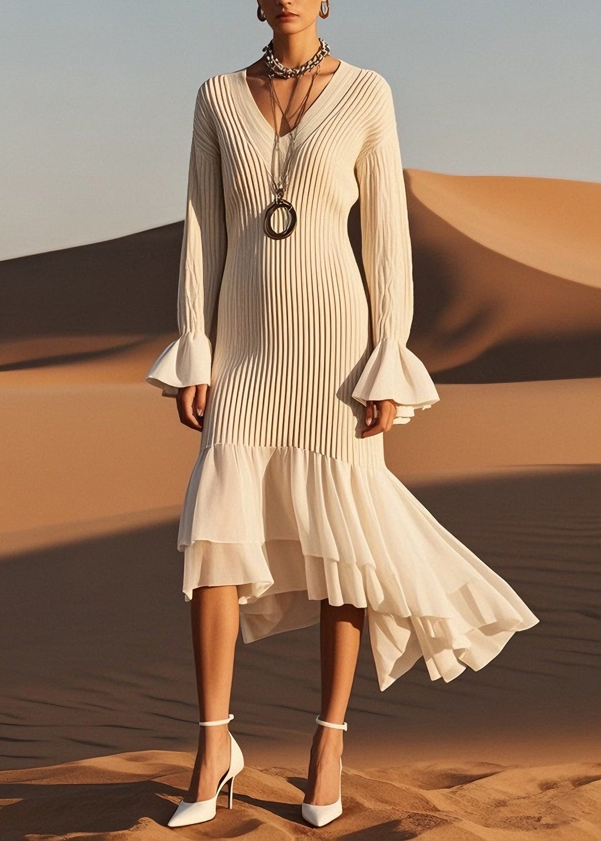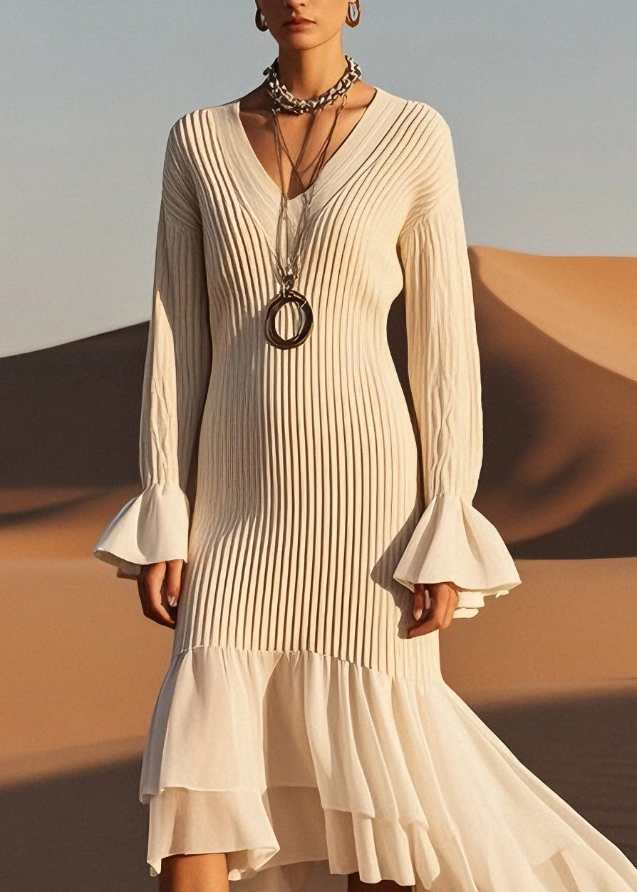 Classy V Neck Wrinkled Patchwork Knit Sweater Dress Spring