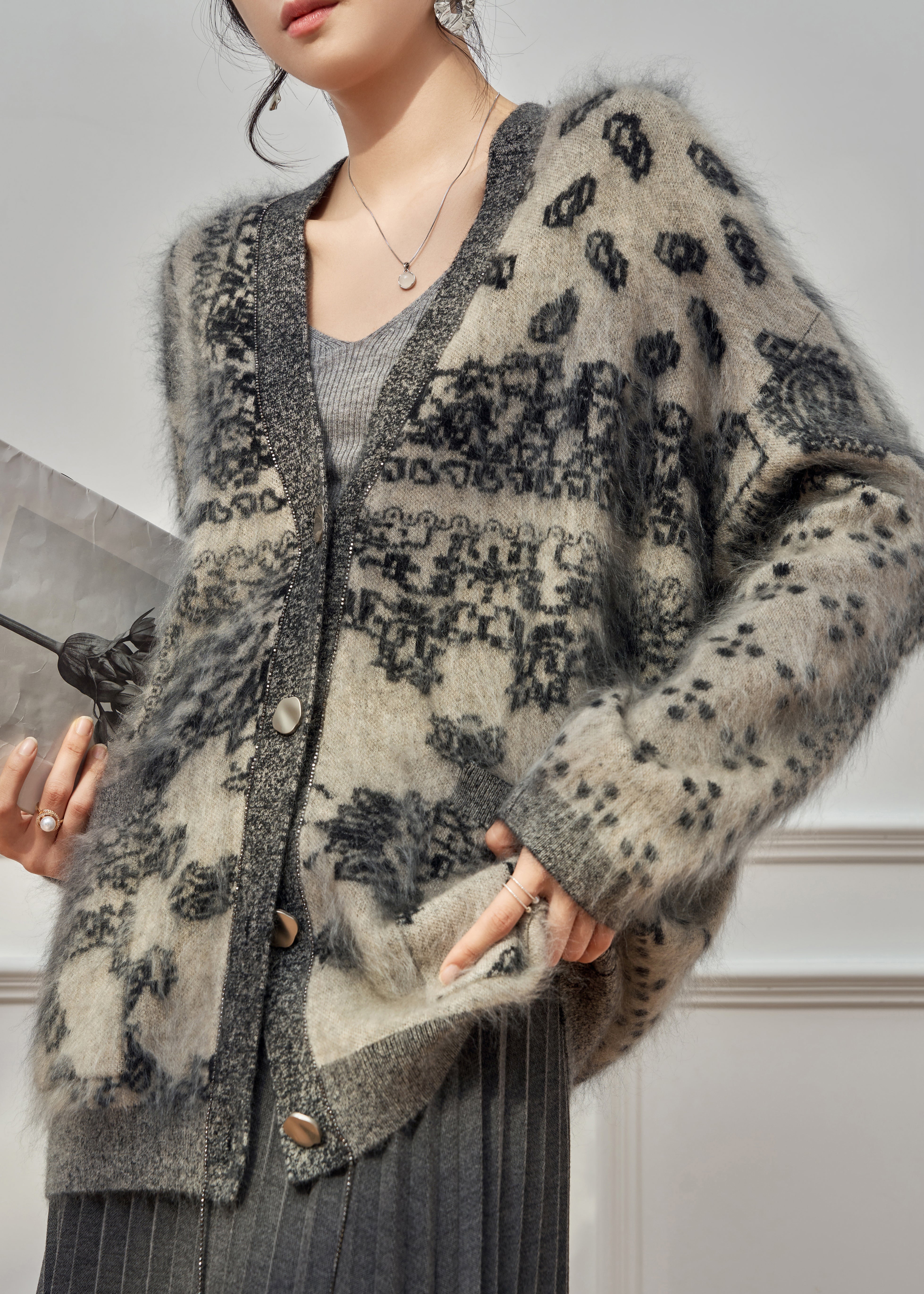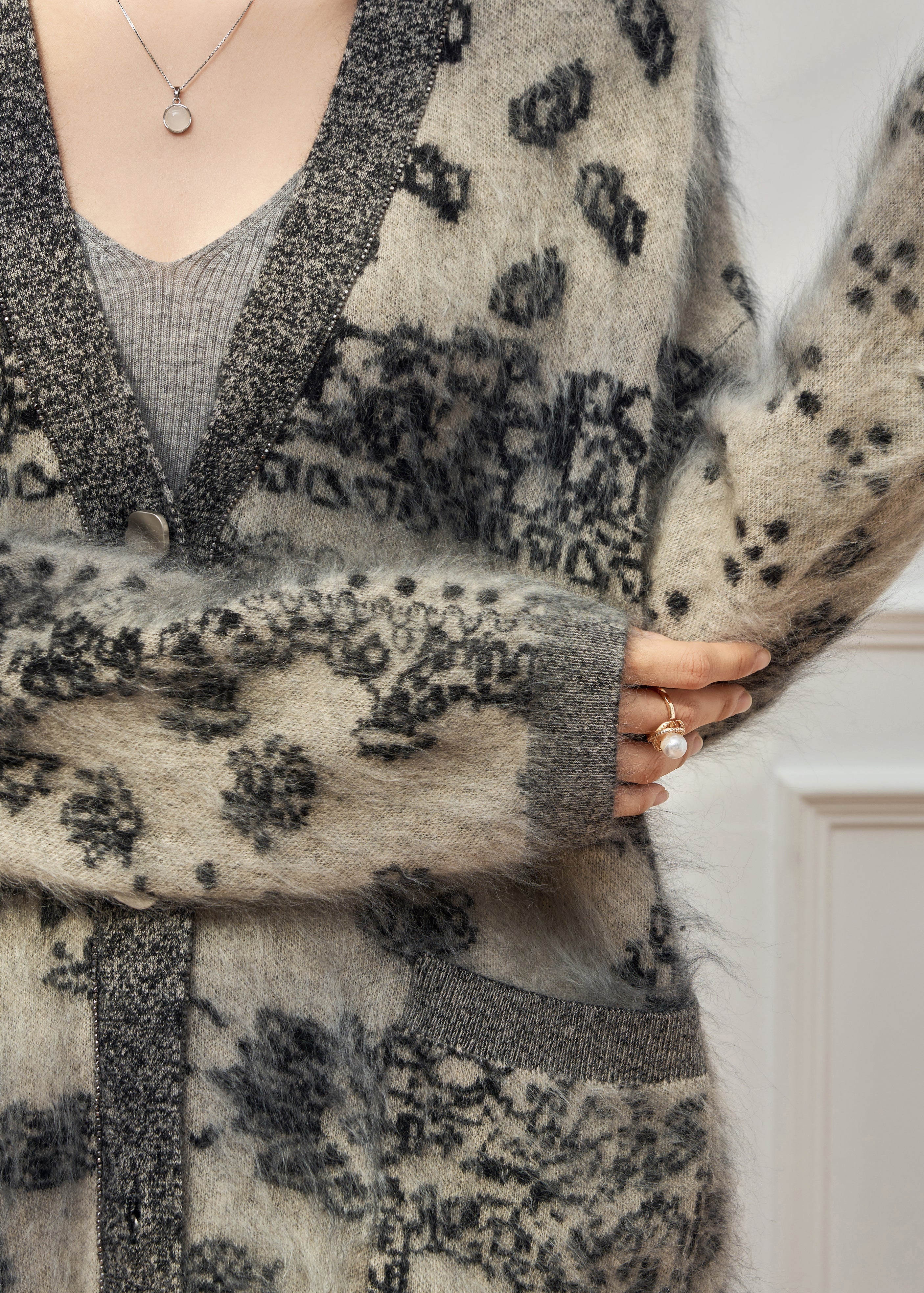 Plus Size Grey V Neck Print Cotton Knit Cardigan Long Sleeve