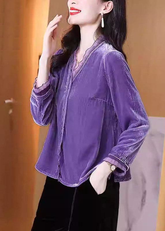 Vintage Purple Tulle Patchwork Side Open Silk Velour Shirt Fall