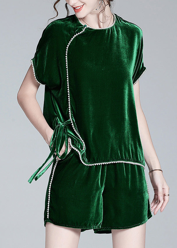 Vintage Green Button Patchwork Tops And Crop Pants Silk Two Pieces Set Fall