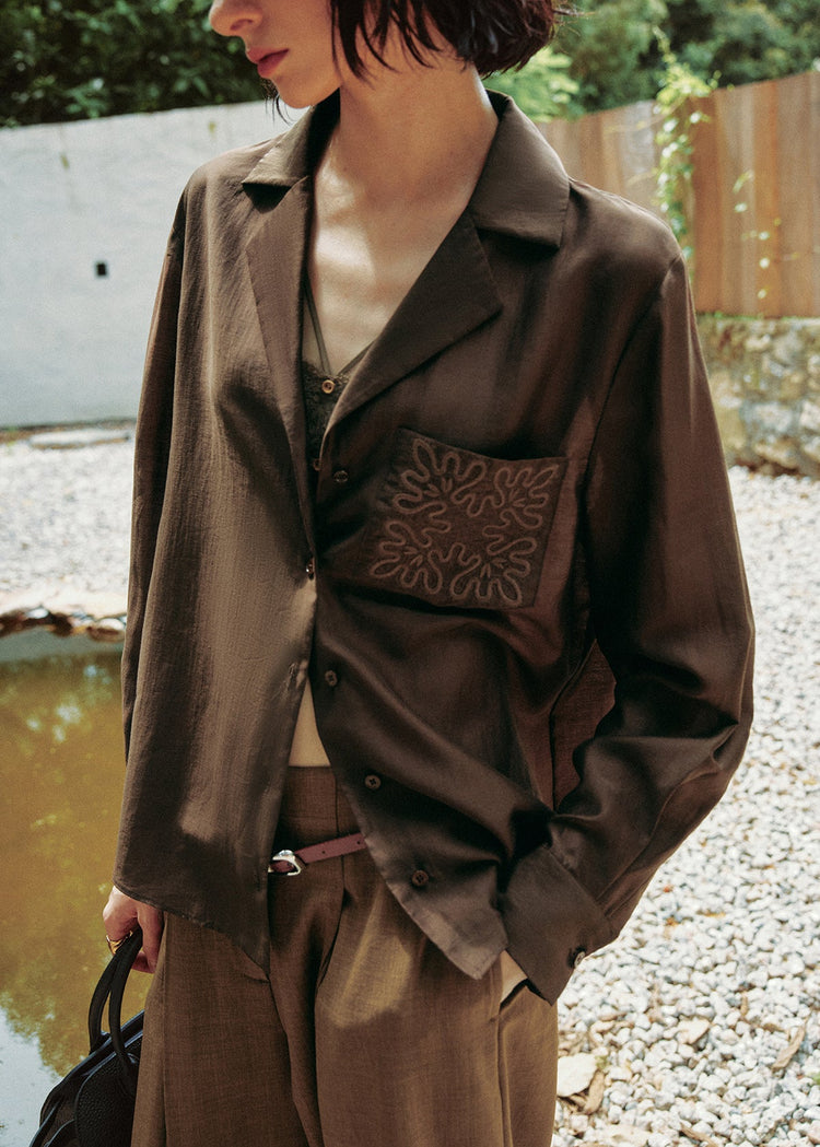 Art Brown Peter Pan Collar Embroidered Cotton Blouse Top Fall