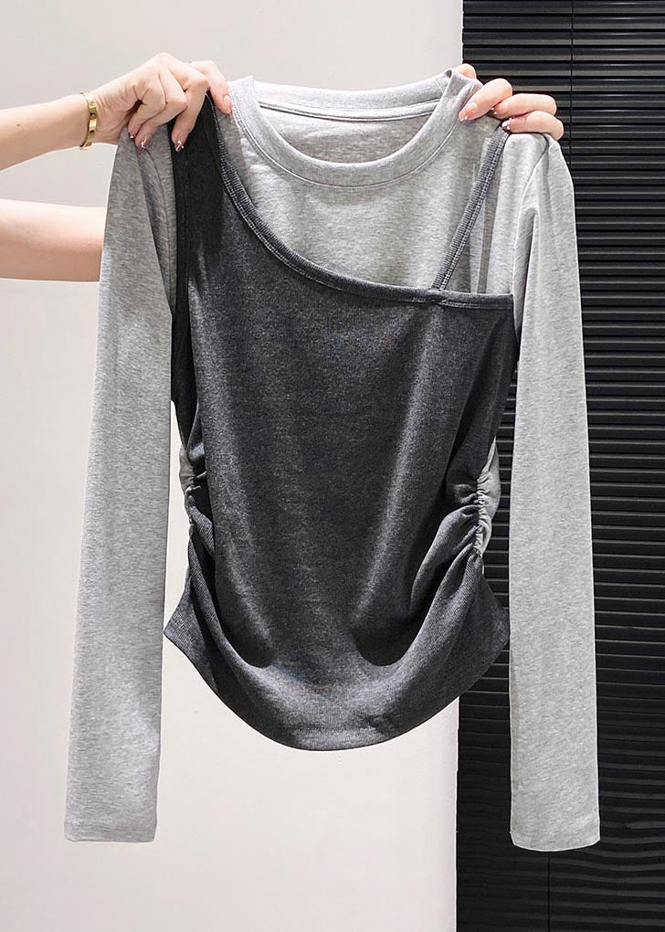 Art Red Asymmetrical Patchwork Cotton Fake Two Piece Blouses Fall