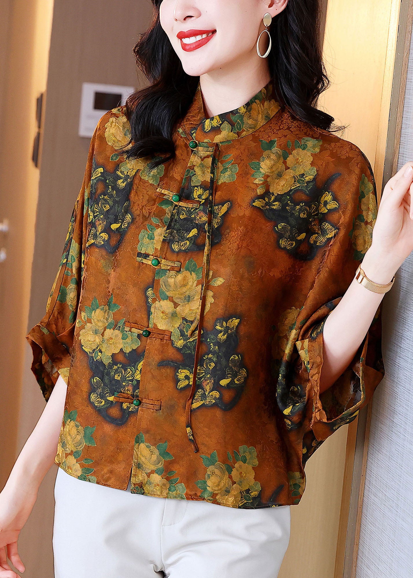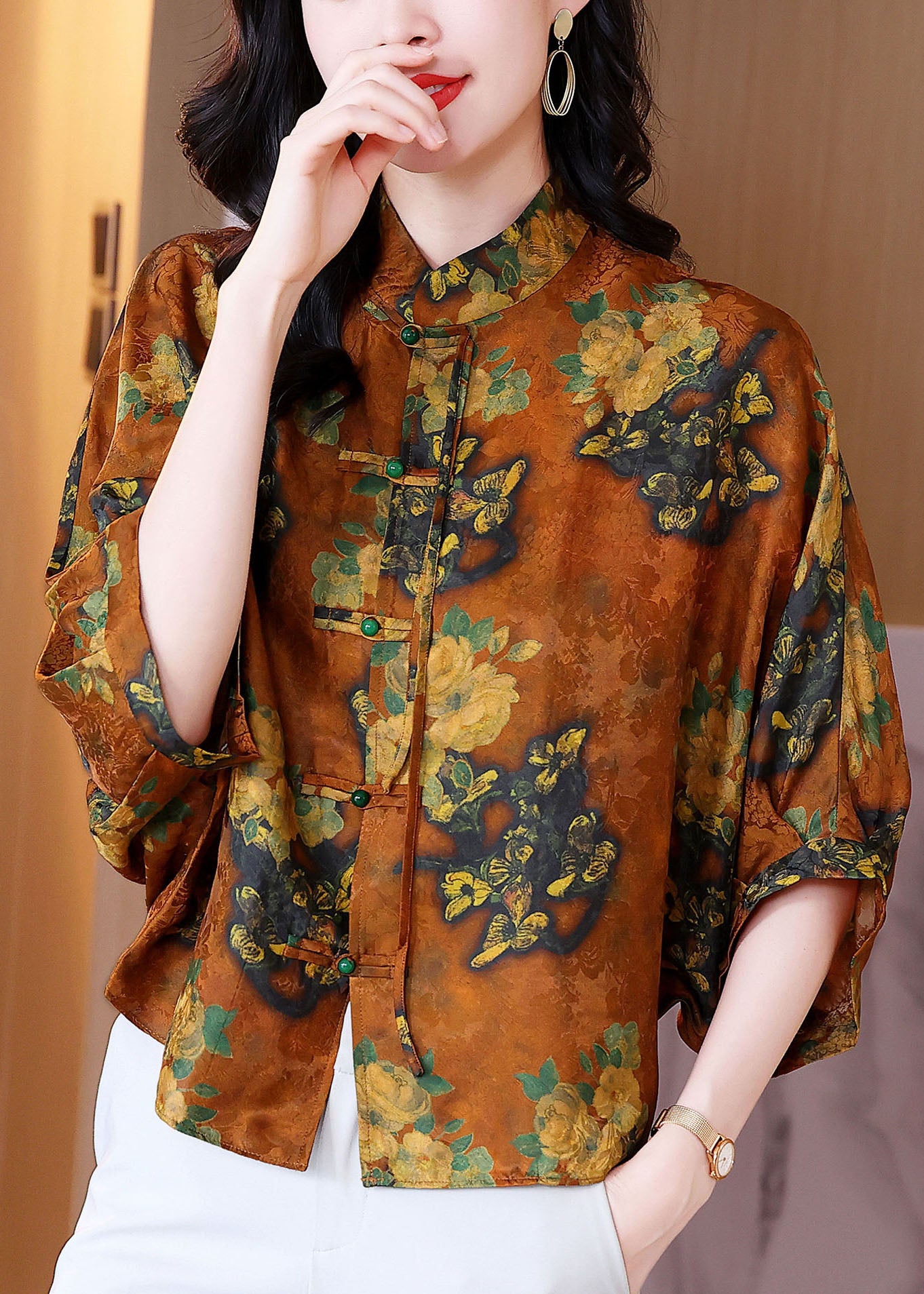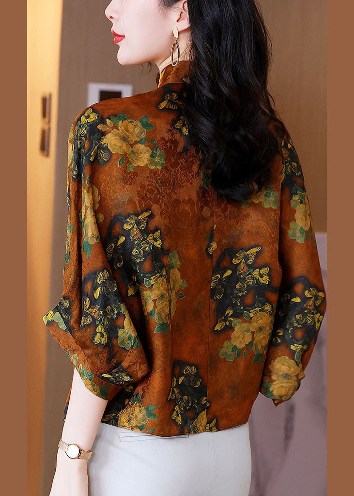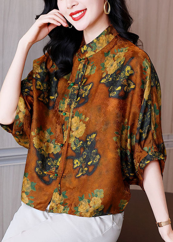 Bohemian Orange Stand Collar Oriental Button Print Silk Blouses Batwing Sleeve