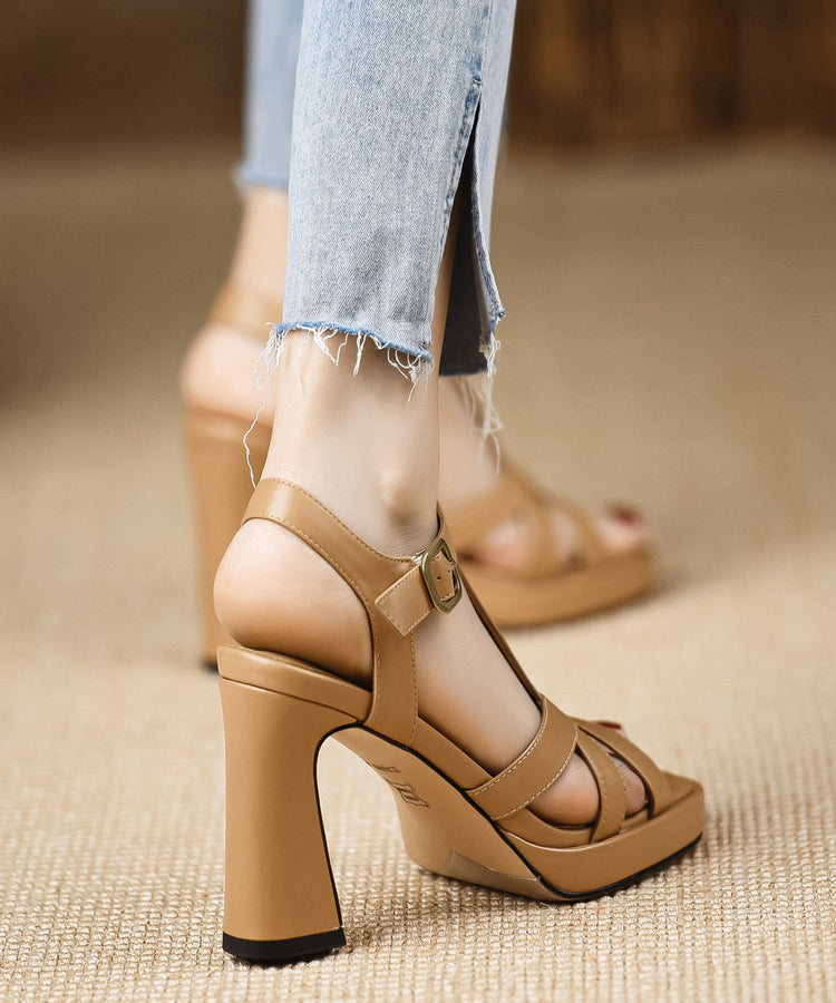 Classy Splicing Chunky Sandals Black Cowhide Leather Peep Toe