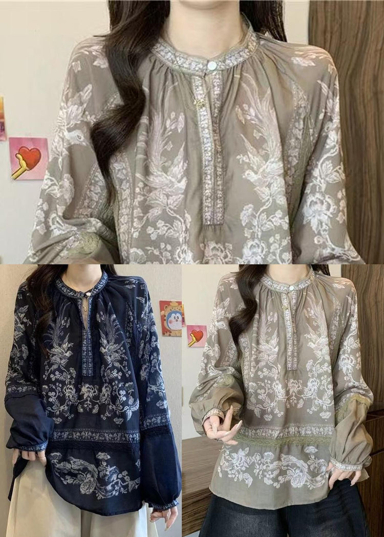 DIY Khaki Oversized Print Cotton Blouse Top Fall