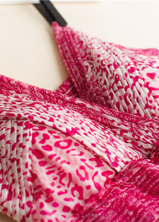 Boho Rose Print Wrinkled Patchwork Silk Spaghetti Strap Dress Sleeveless