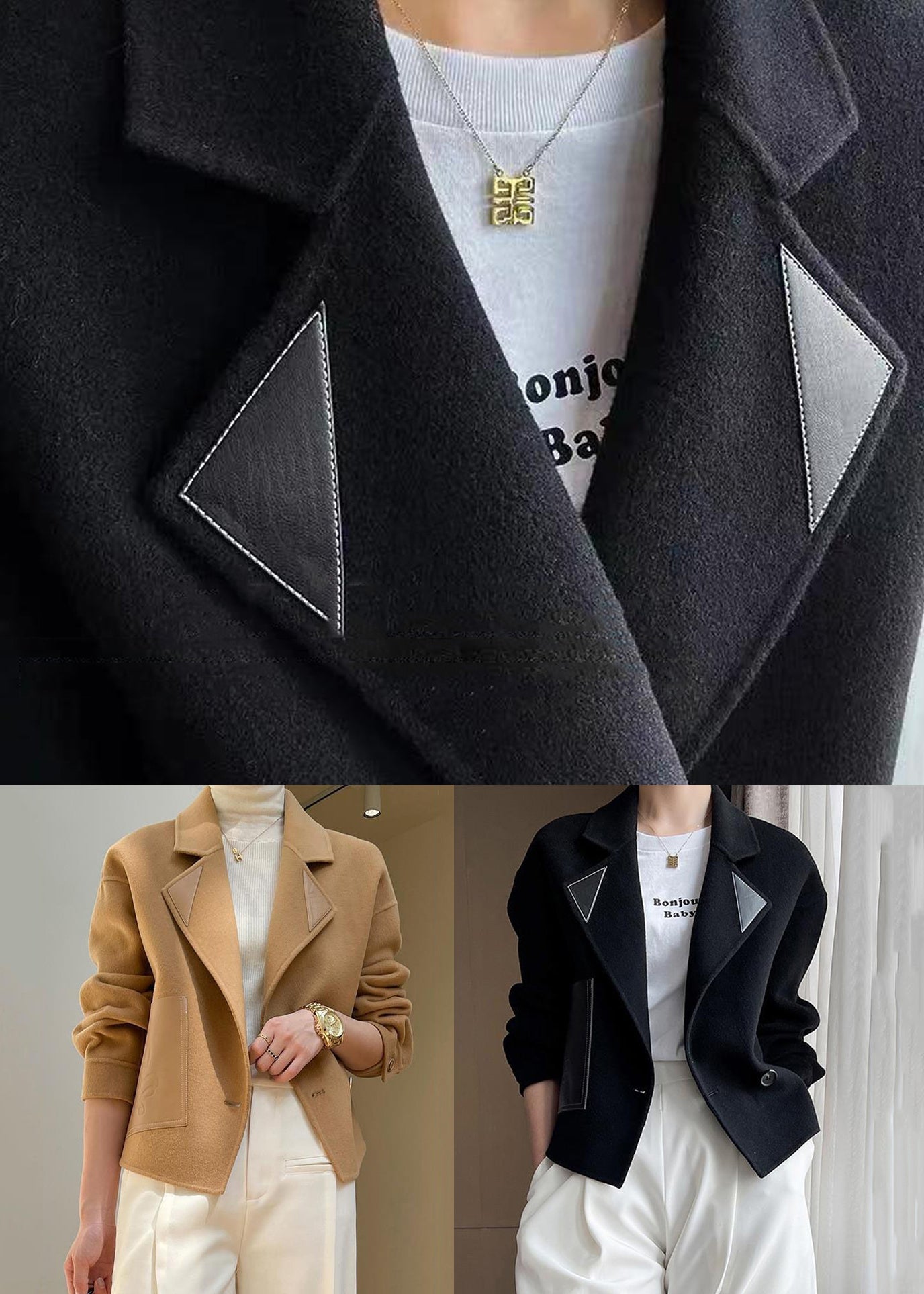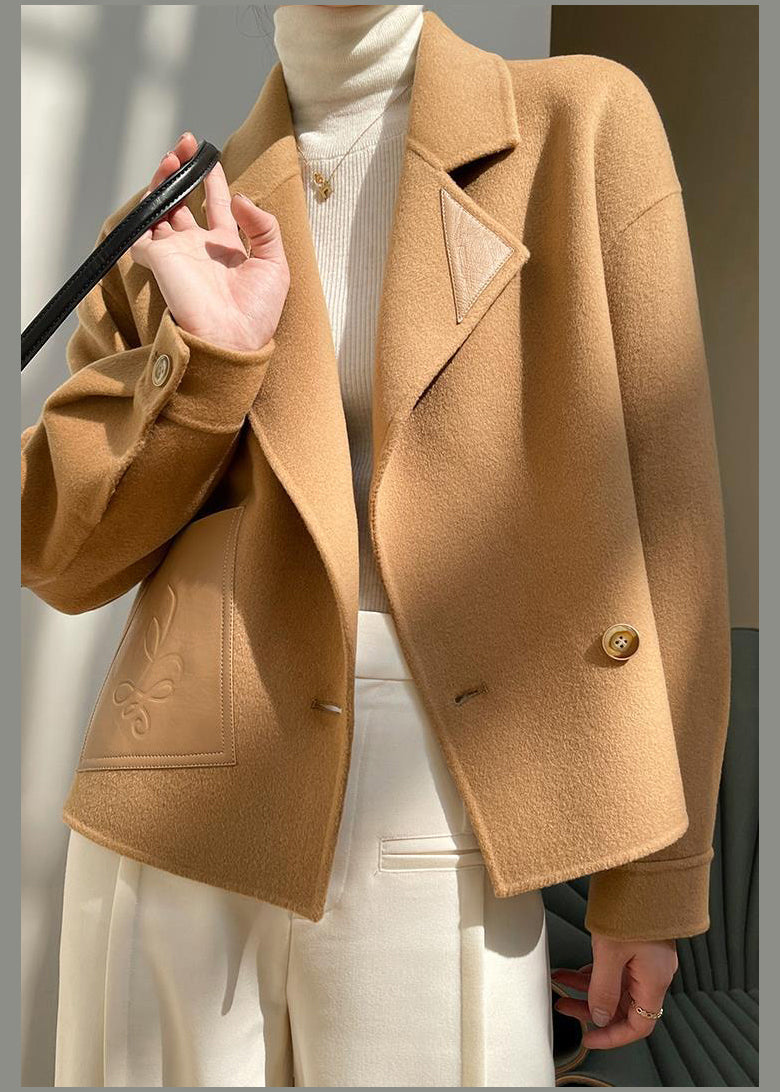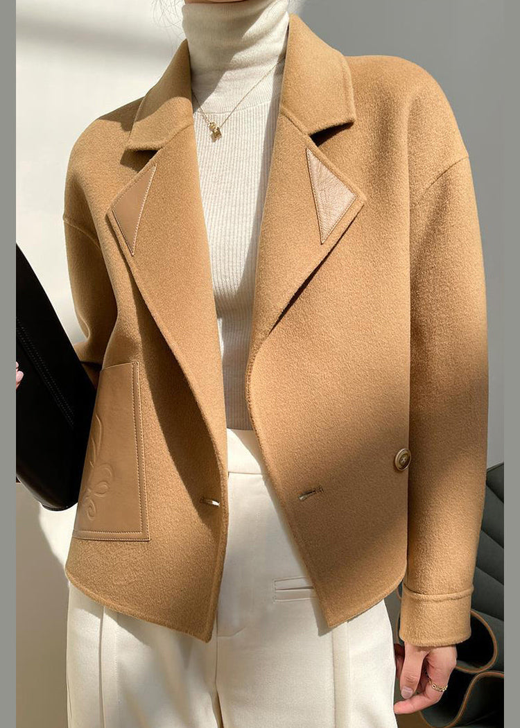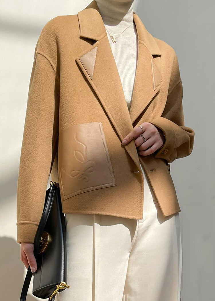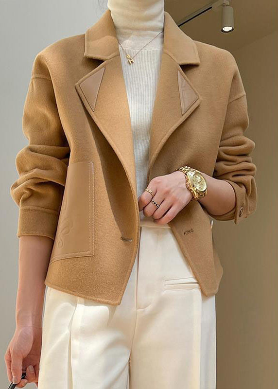 Camel Pockets Patchwork Woolen Coat Button Long Sleeve