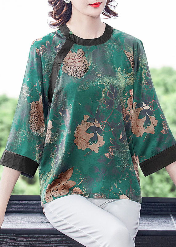 Chinese Style Green O-Neck Patchwork Print Silk Shirt Top Bracelet Sleeve