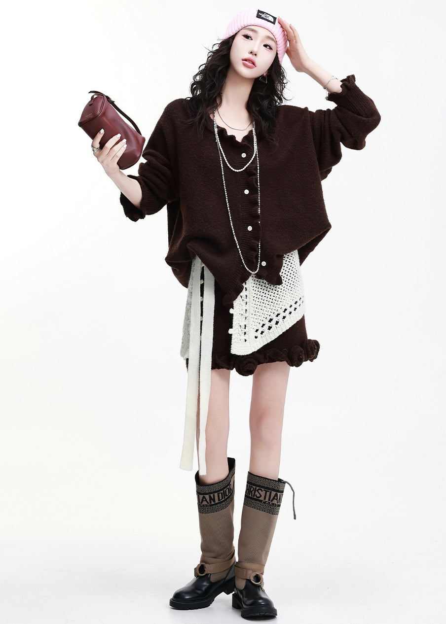Chocolate Thick Knit Two Piece Suit Set Ruffled Flower Decorated Winter