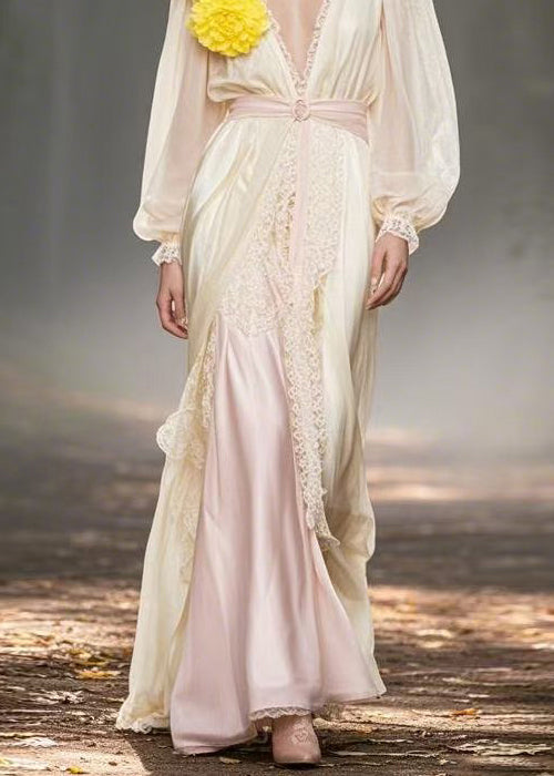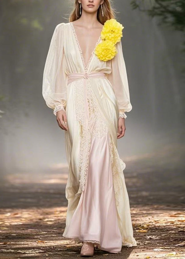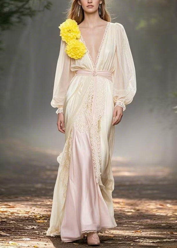 Classy V Neck Lace Floral Patchwork Chiffon Dresses Spring