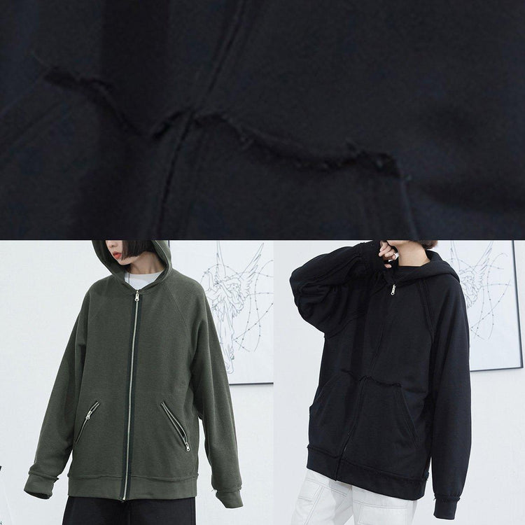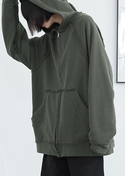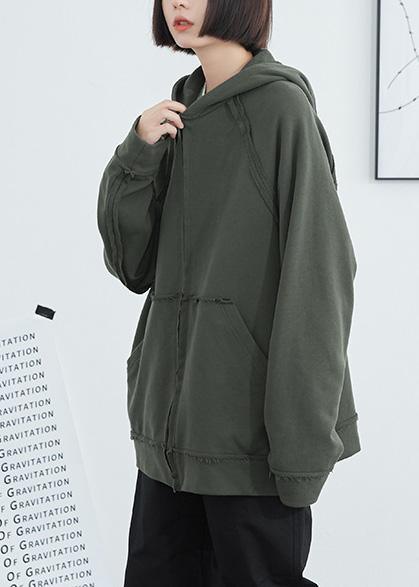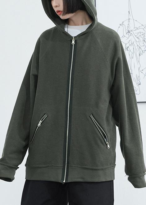 Elegant dark green cotton crane tops hooded zippered daily autumn shirt