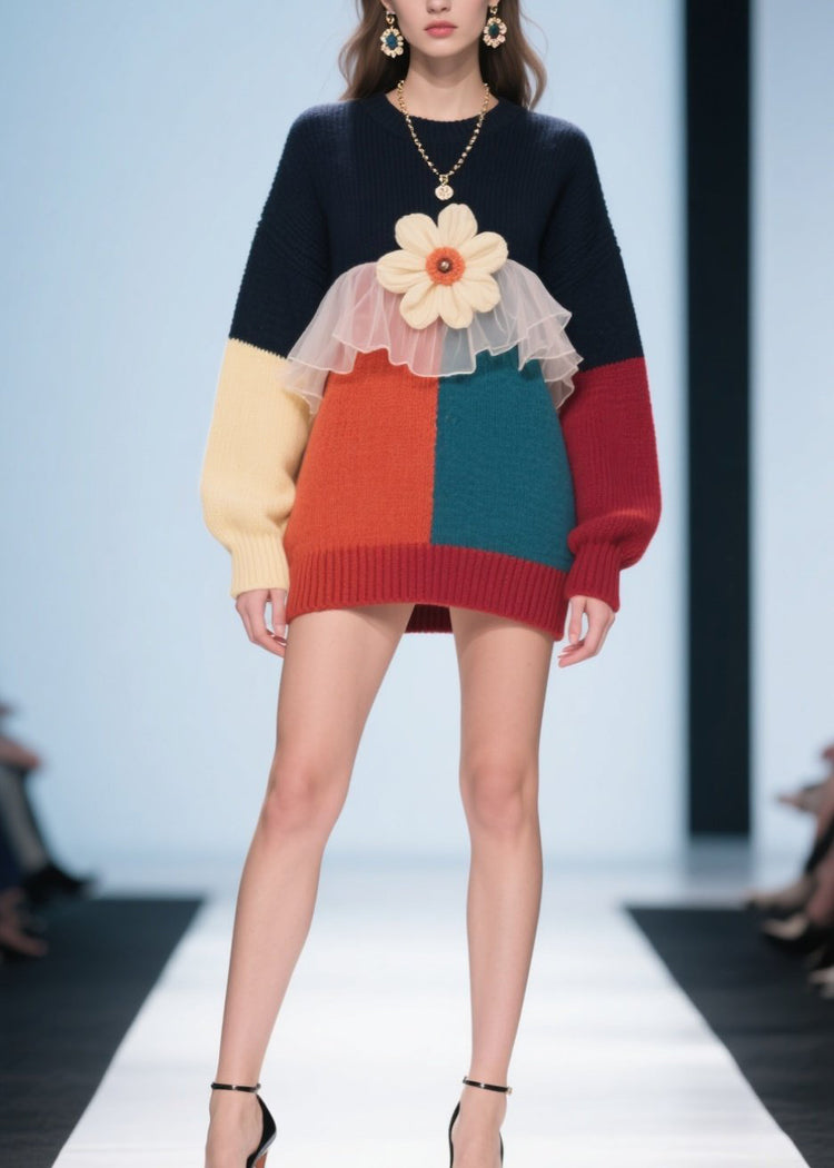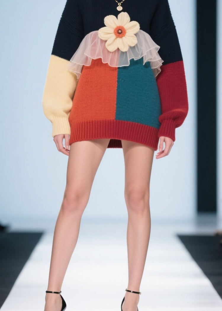 Fashion Colorblock O Neck Floral Tulle Patchwork Knit Pullover Fall