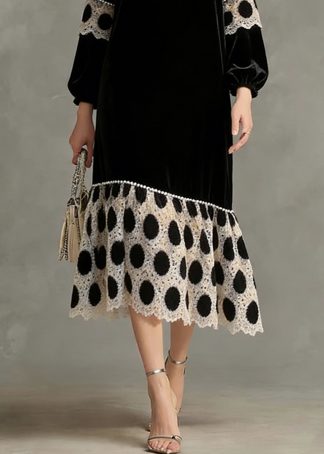 French Black V Neck Patchwork Silk Velvet Long Dress Spring