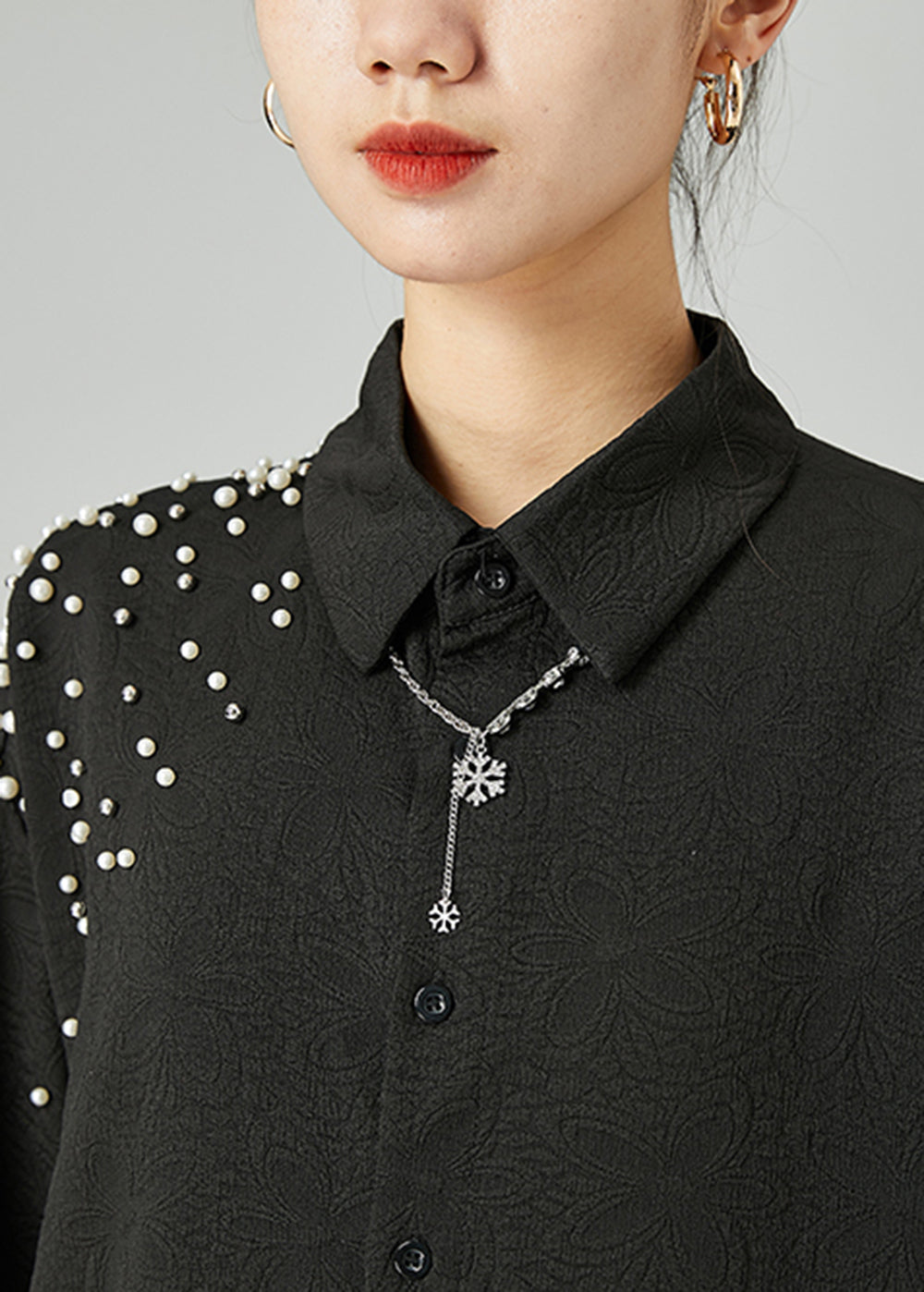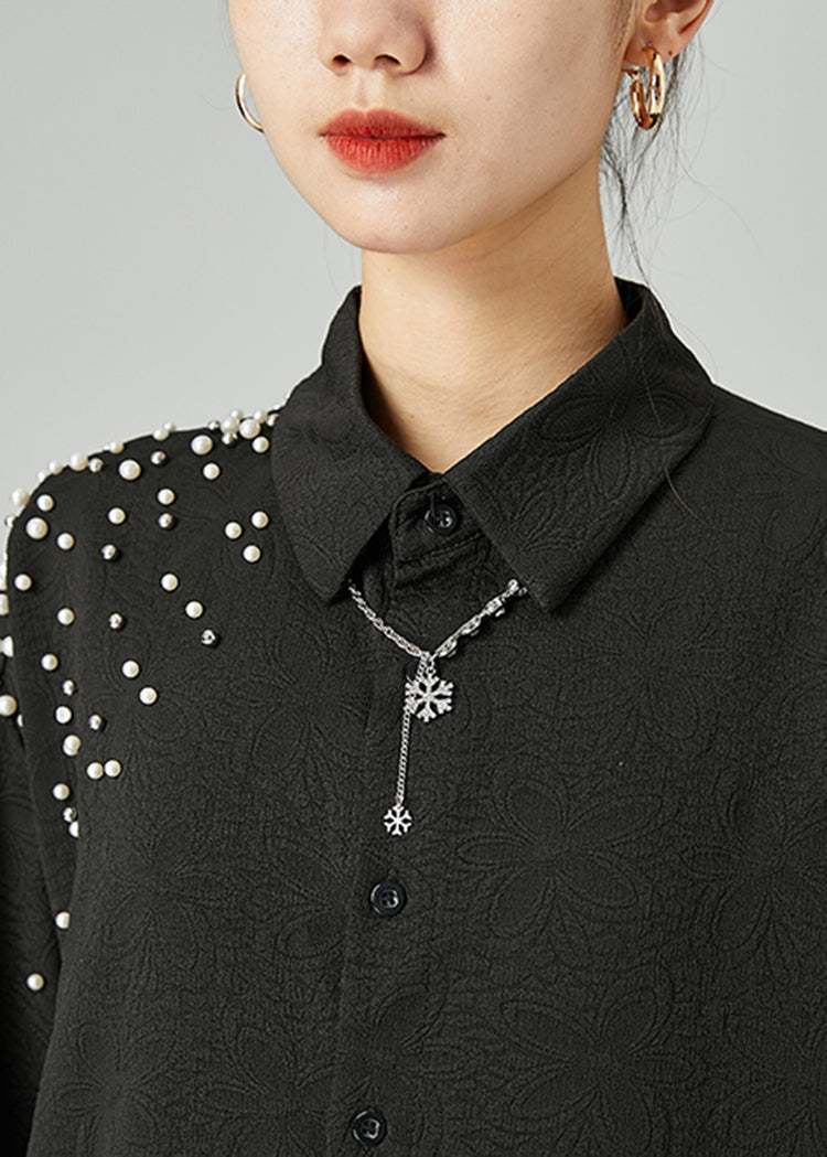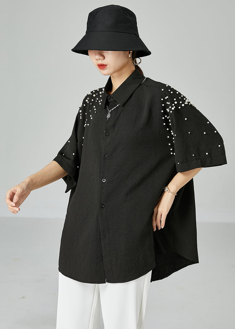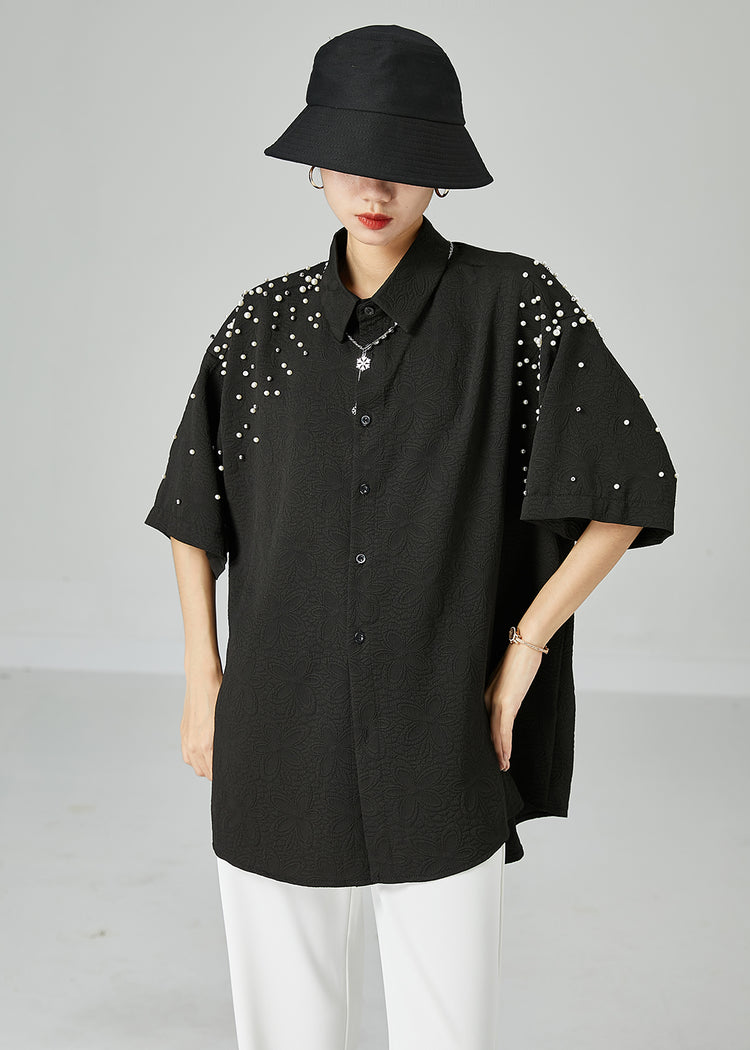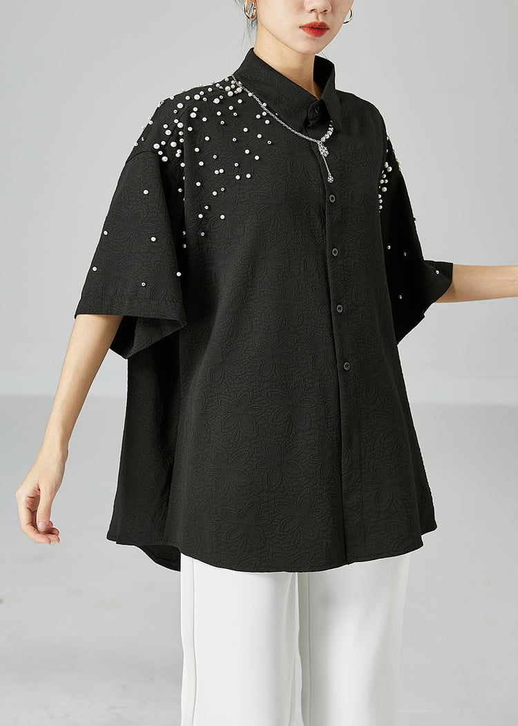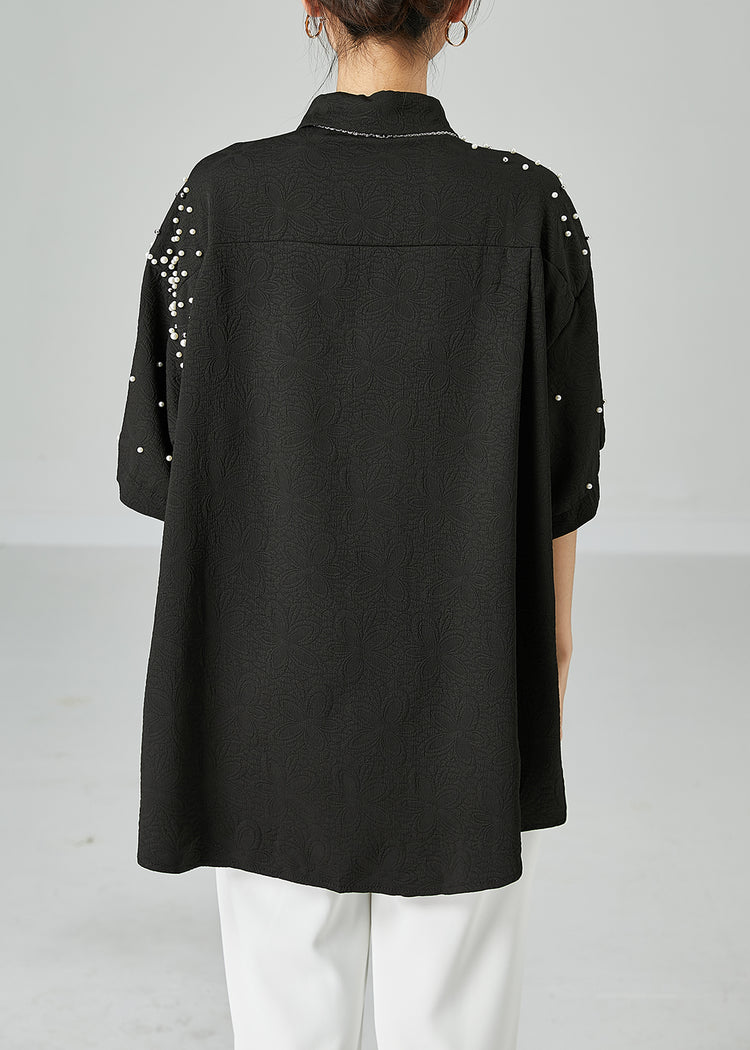 Handmade Black Oversized Nail Bead Jacquard Cotton Blouses Short Sleeve