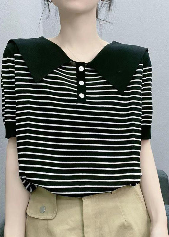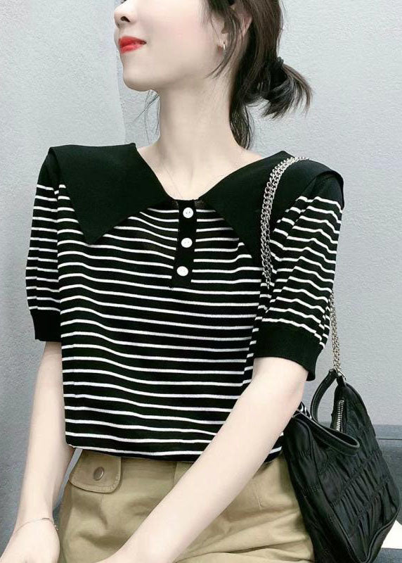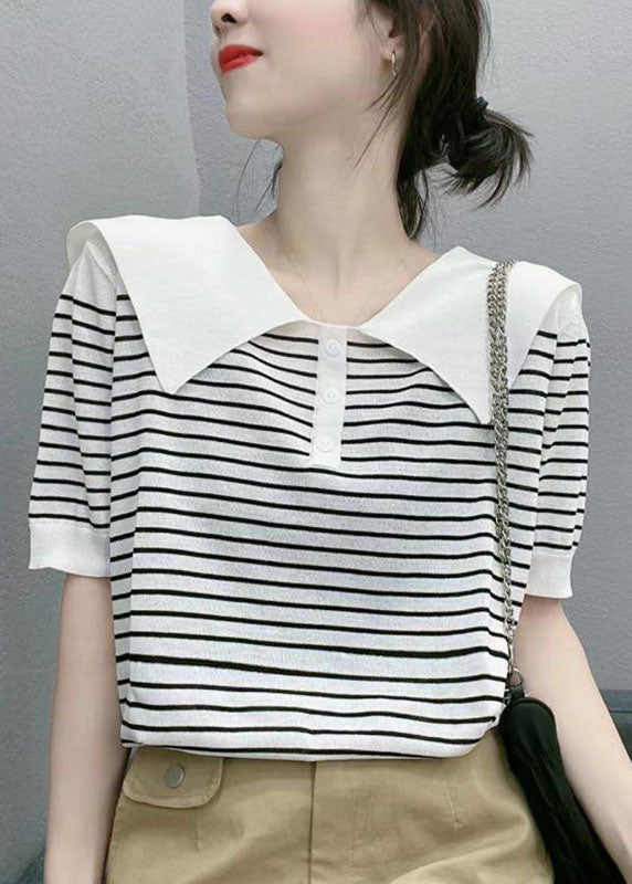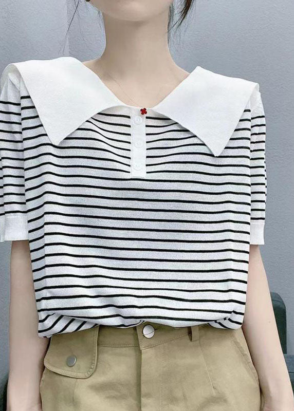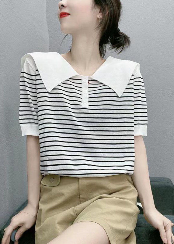 Handmade White Sailor Collar Striped Cotton T Shirt Summer