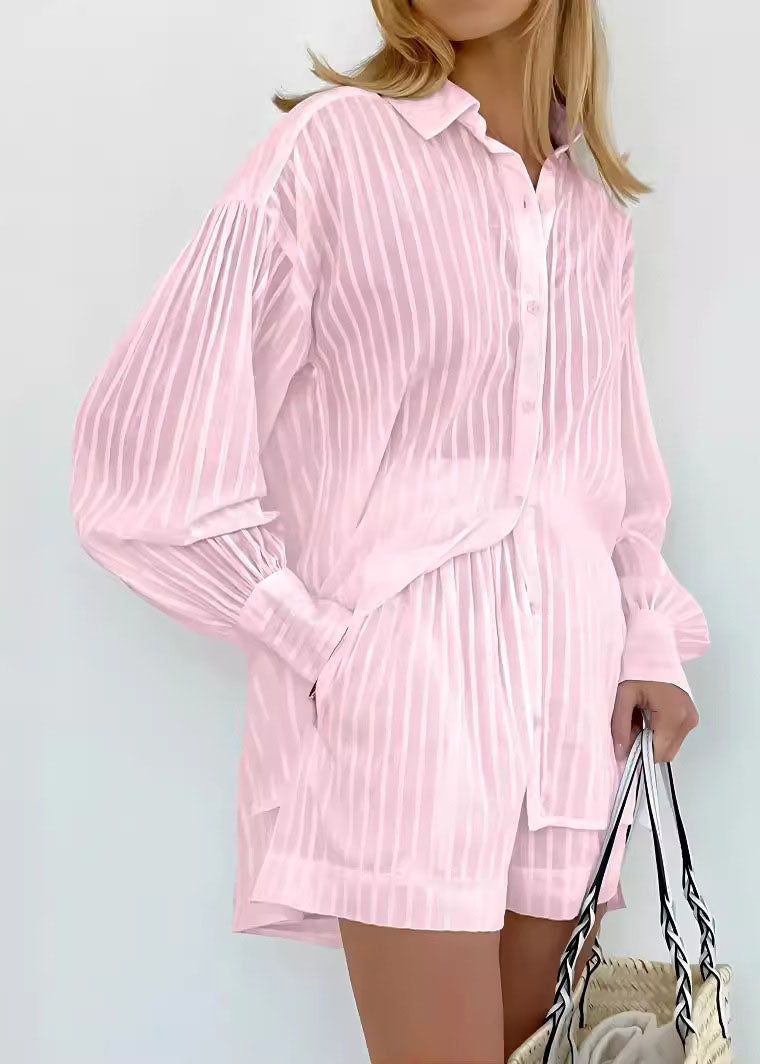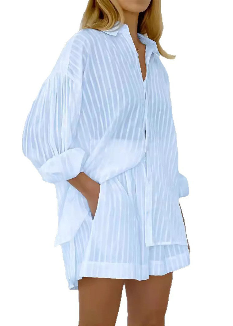 Modern White Striped Shirts And Shorts Cotton Two Pieces Set Spring