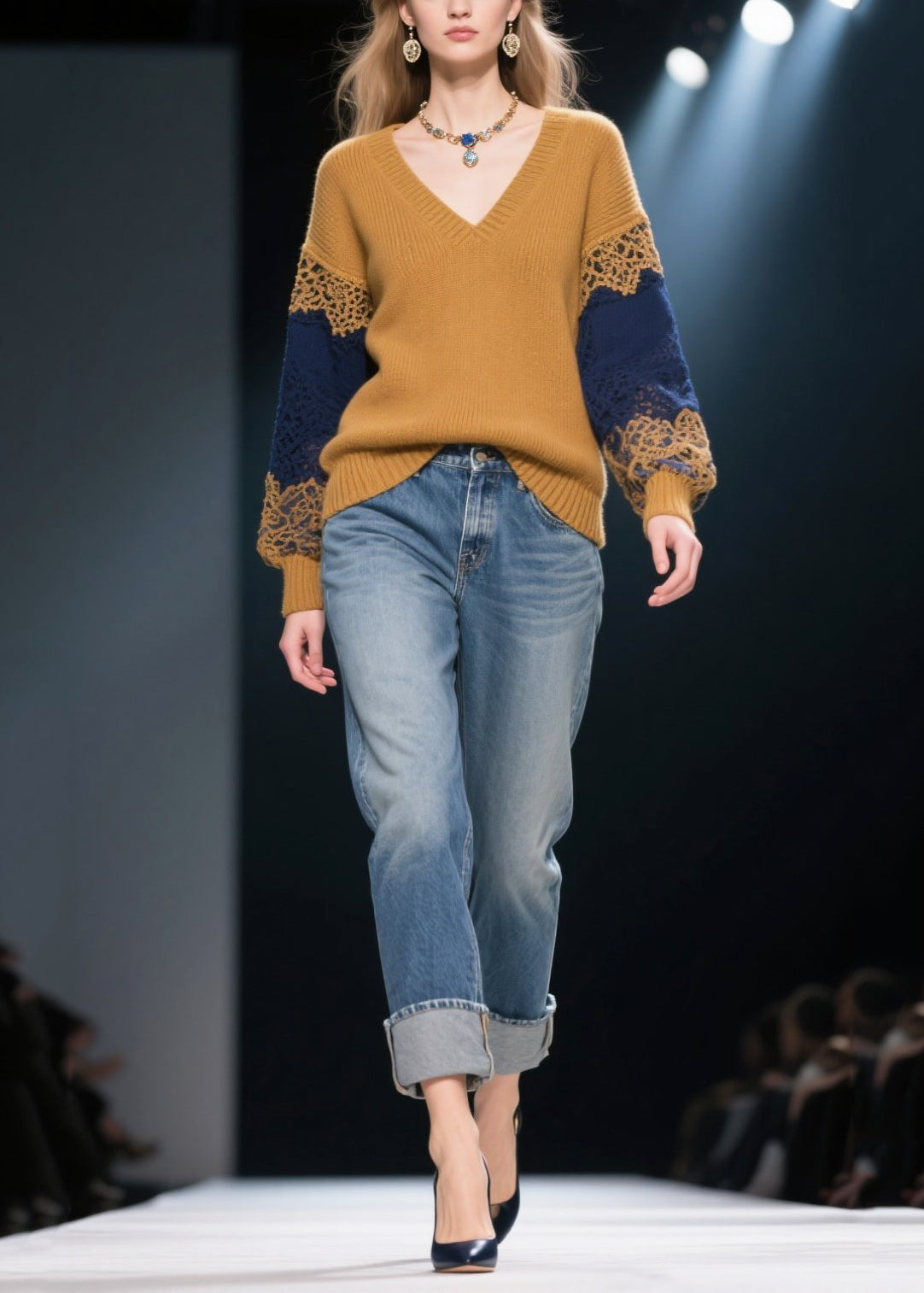 Natural Brown V Neck Patchwork Lace Knit Pullover Winter