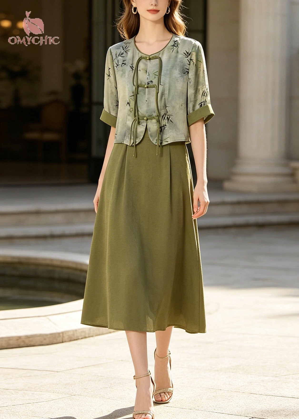 Retro Green Print Chinese Button Silk Dress Two Piece Set Summer