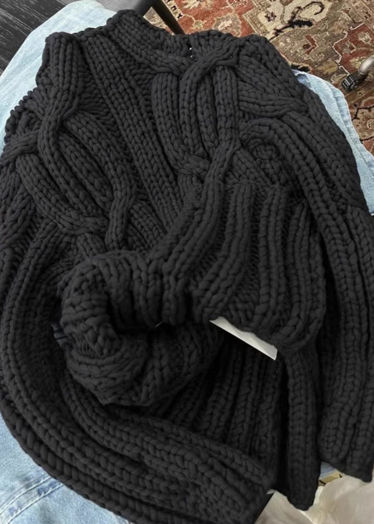 Simple Black Turtleneck Patchwork Cotton Cable Knit Sweaters Fall