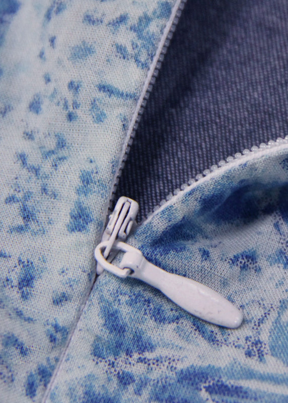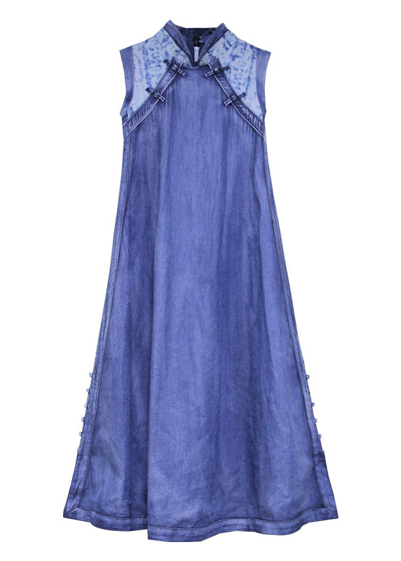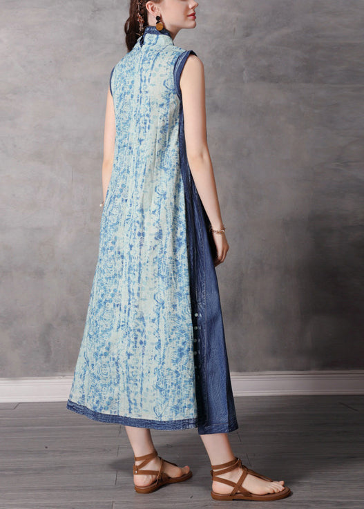 2022 Blue Stand Collar Button Patchwork Long Denim Dress Sleeveless