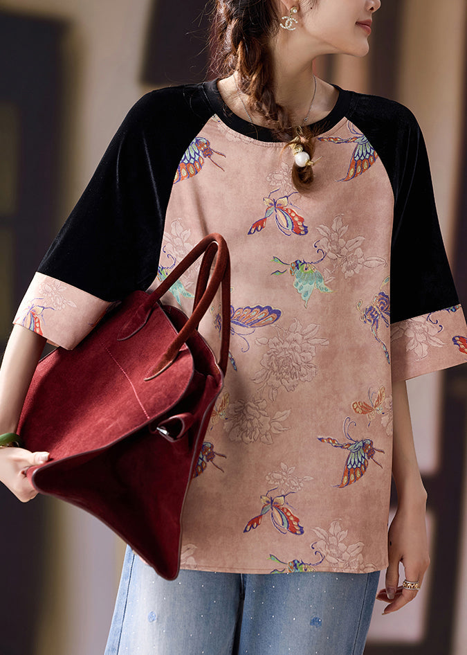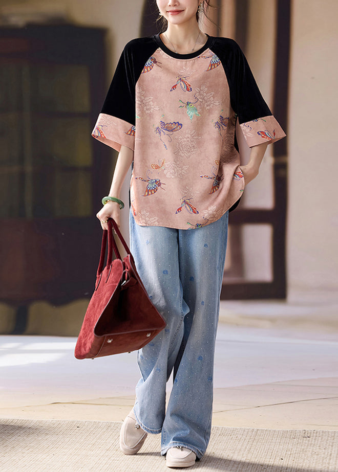Vintage Pink Patchwork Cotton Oriental Tanks Butterfly Print Half Sleeve
