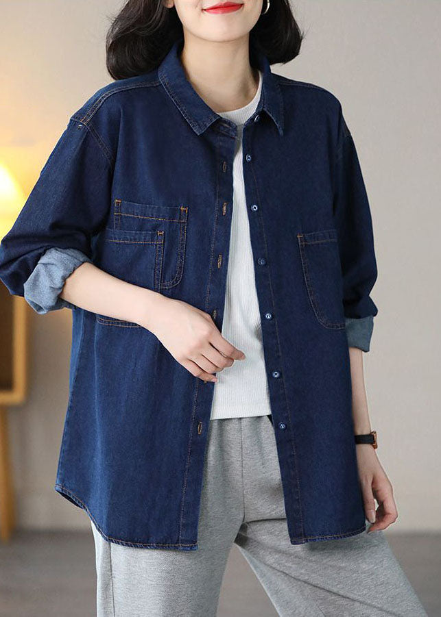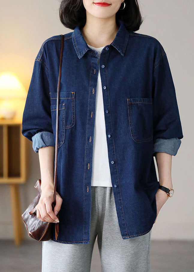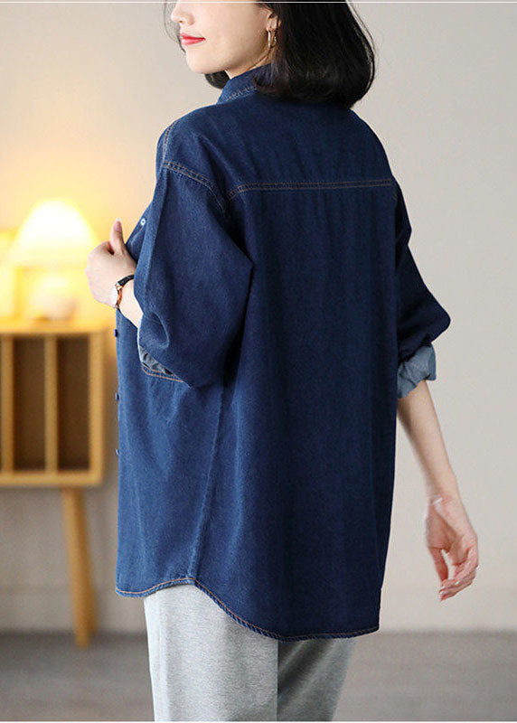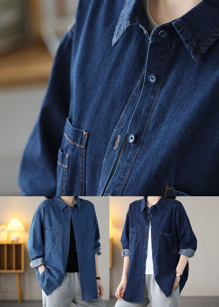 Navy Cotton Denim Coats Oversized Turn-down Collar Spring