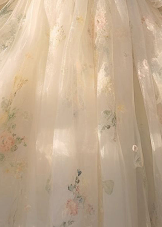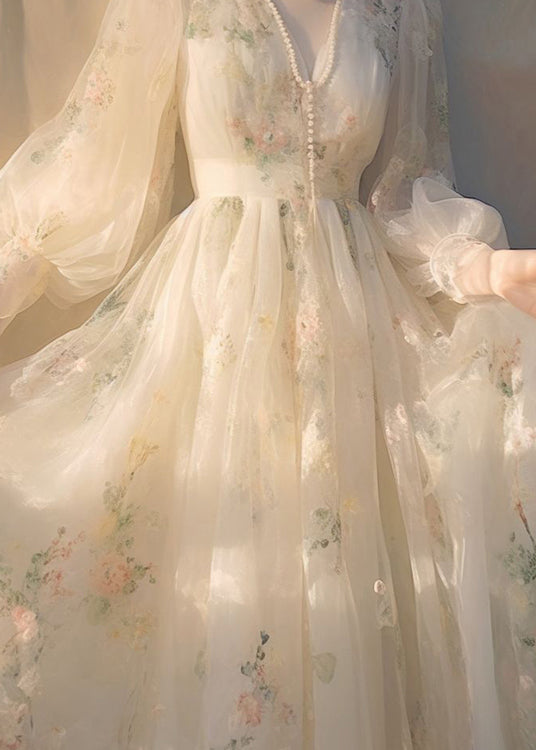 Elegant Beige V Neck High Waist Tulle Maxi Dresses Long Sleeve