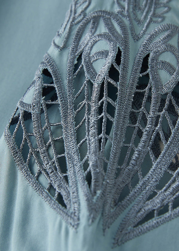 Plus Size Blue O Neck Hollow Out Embroidered Cotton T Shirt Summer