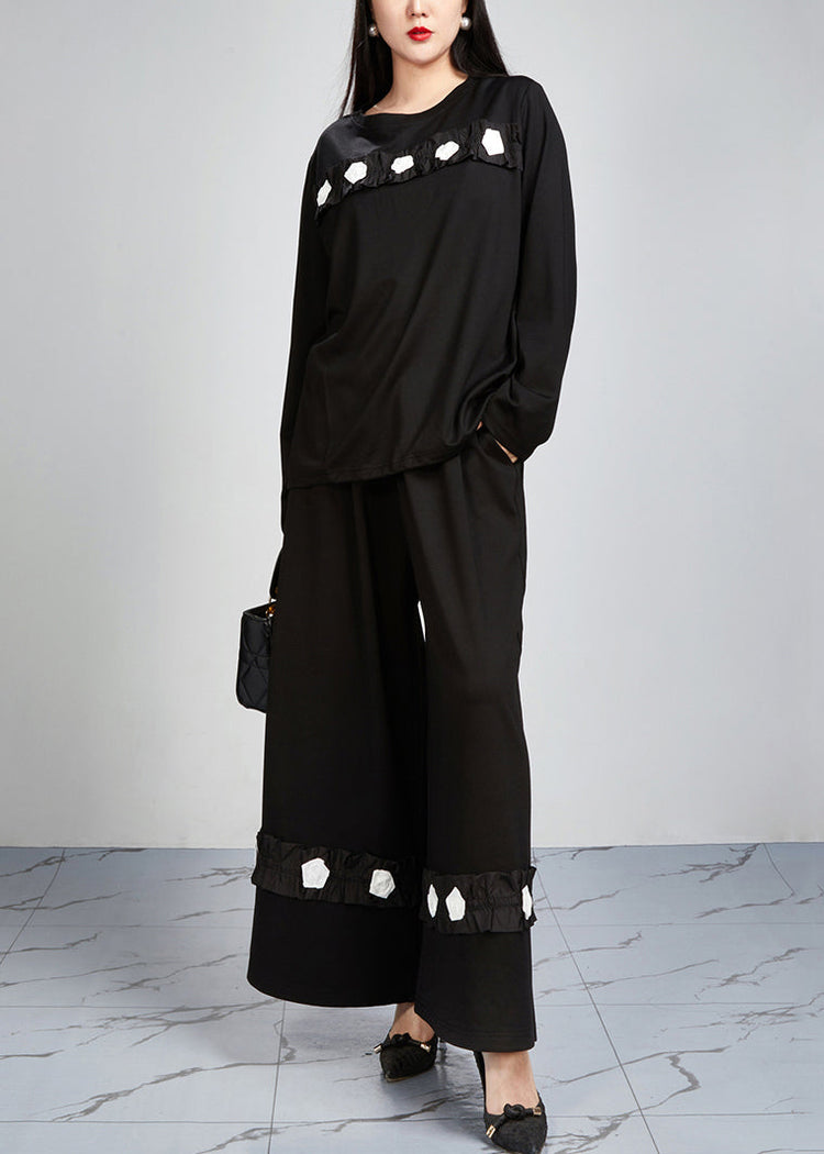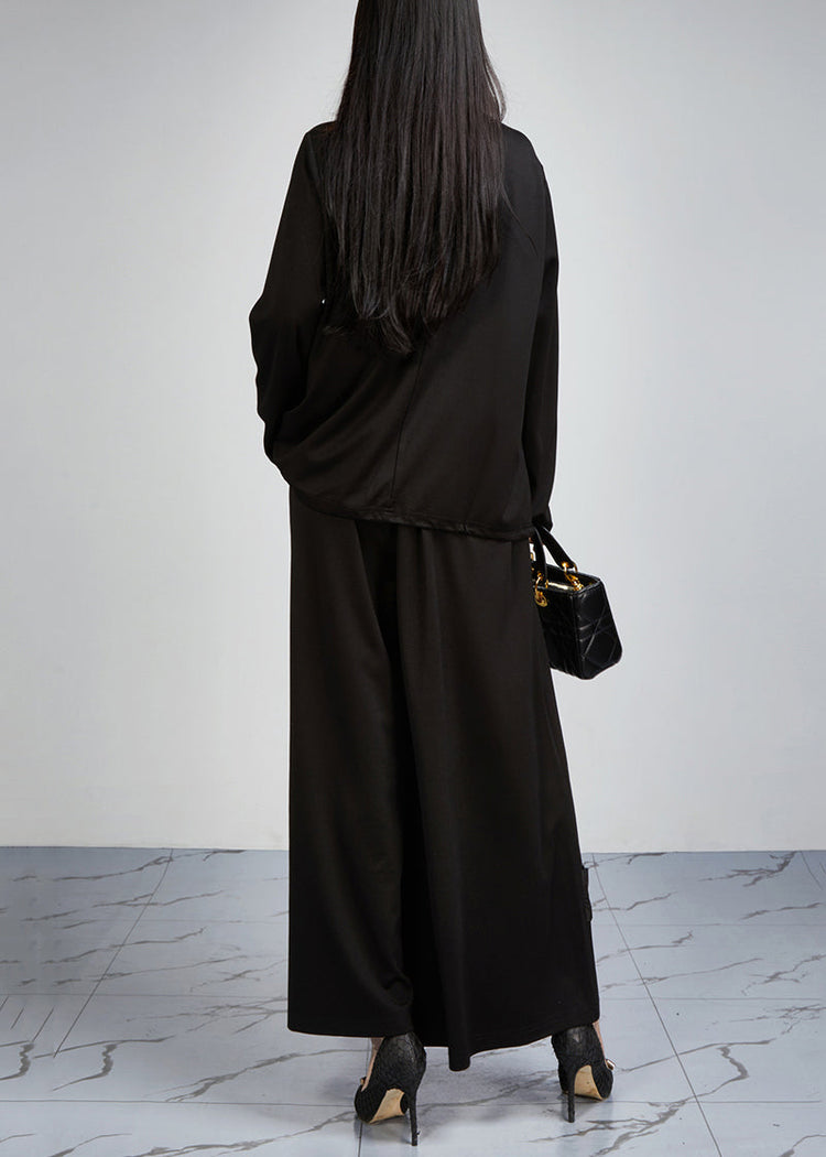 Loose Black Pockets Tops And Wide Leg Pants Cotton Two-Piece Set Fall