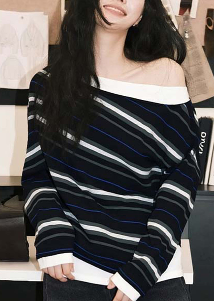 French Black Striped Cold Shoulder Cotton T Shirts Fall