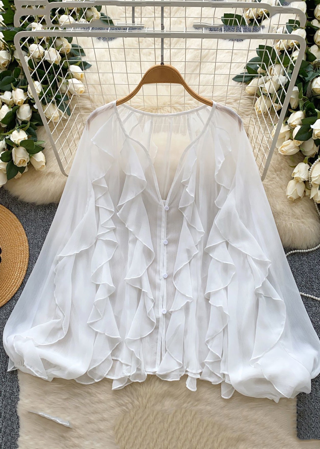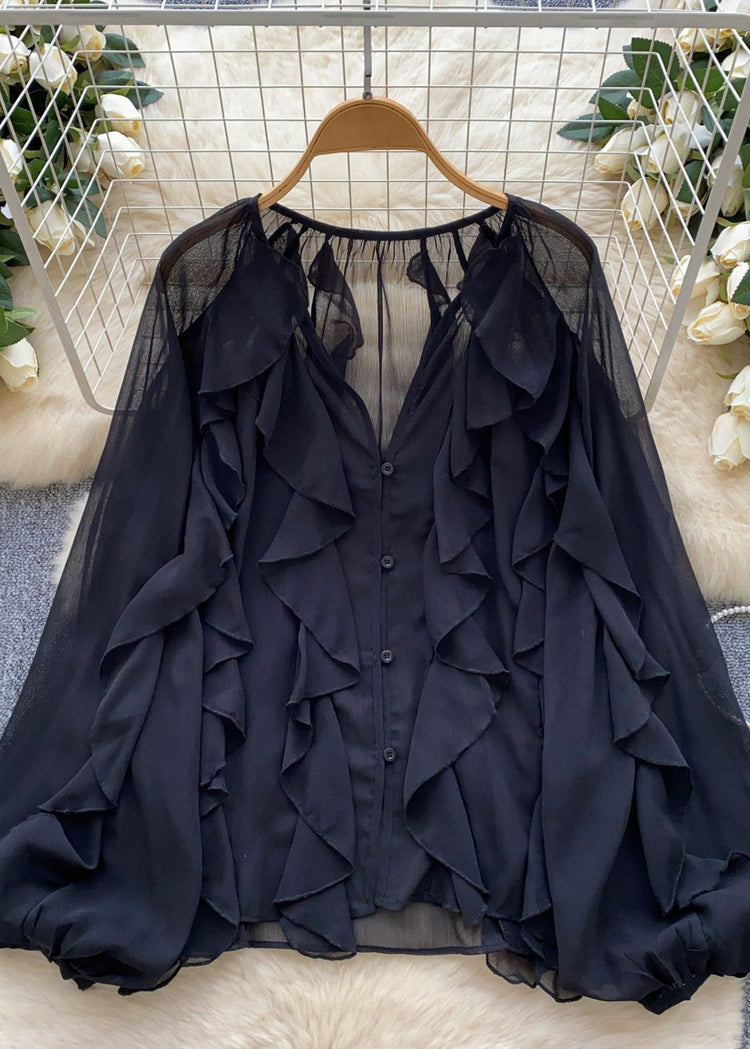 Vogue Red V Neck Ruffled Button Chiffon Shirts Lantern Sleeve