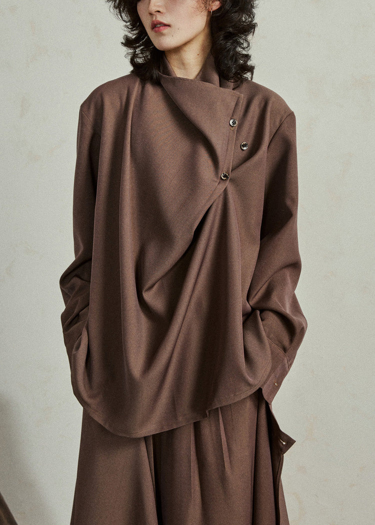 Fine Coffee Asymmetrical Button Shirt Lantern Sleeve