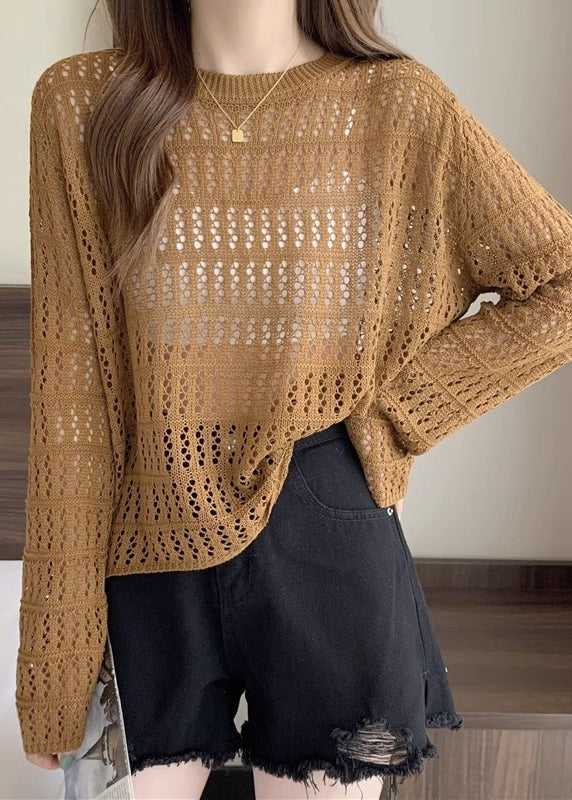 Loose Caramel Hollow Out Cozy Knit T Shirts Long Sleeve