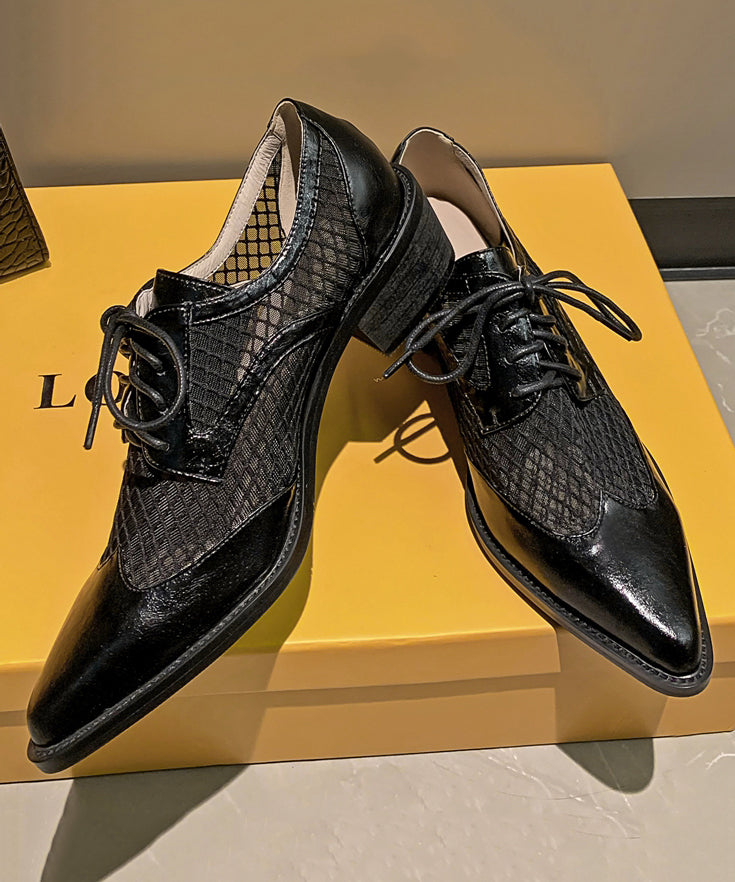 Beige Hollow Out Lace Up Splicing Chunky Shoes Pointed Toe