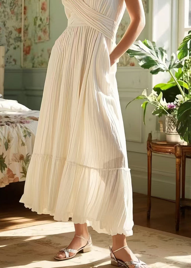 Chic White Exra Large Hem Wrinkled Cotton Cami Dresses Summer
