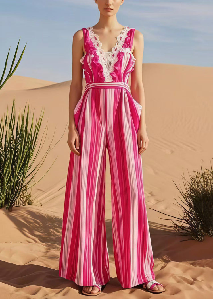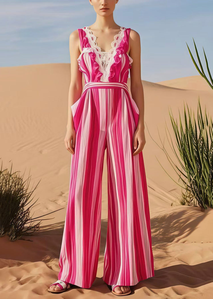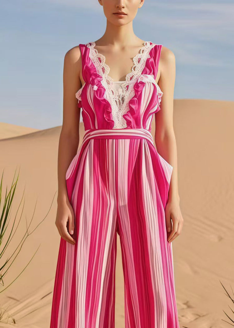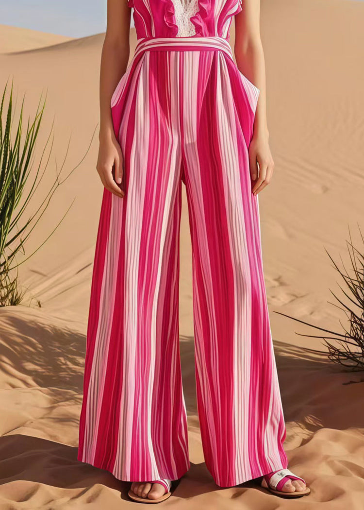 Stylish Rose Striped Ruffled Cotton Overalls Jumpsuit Summer
