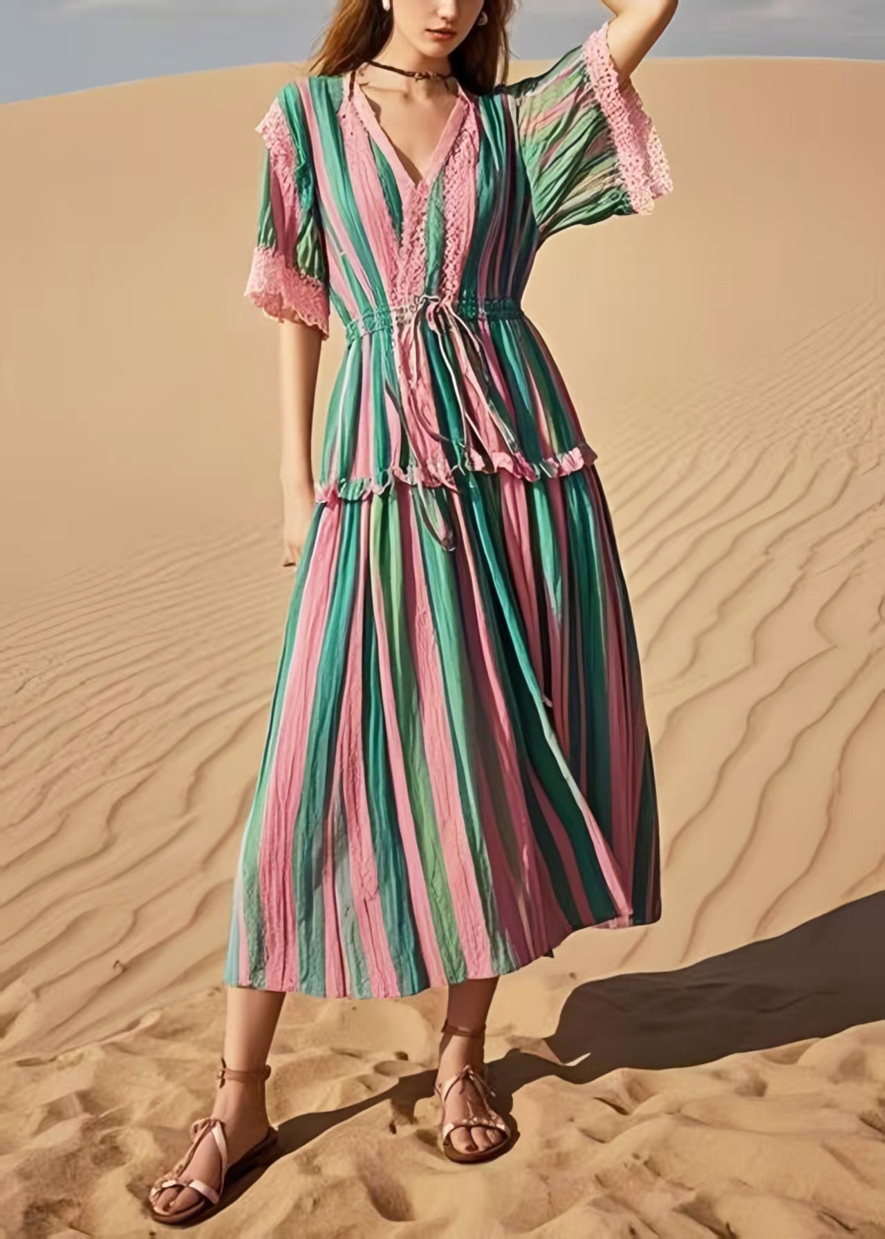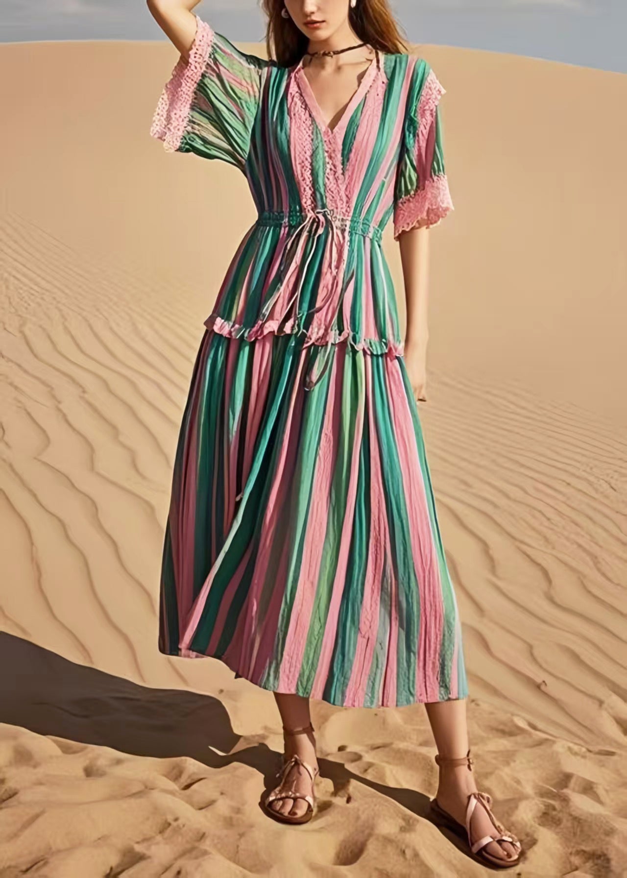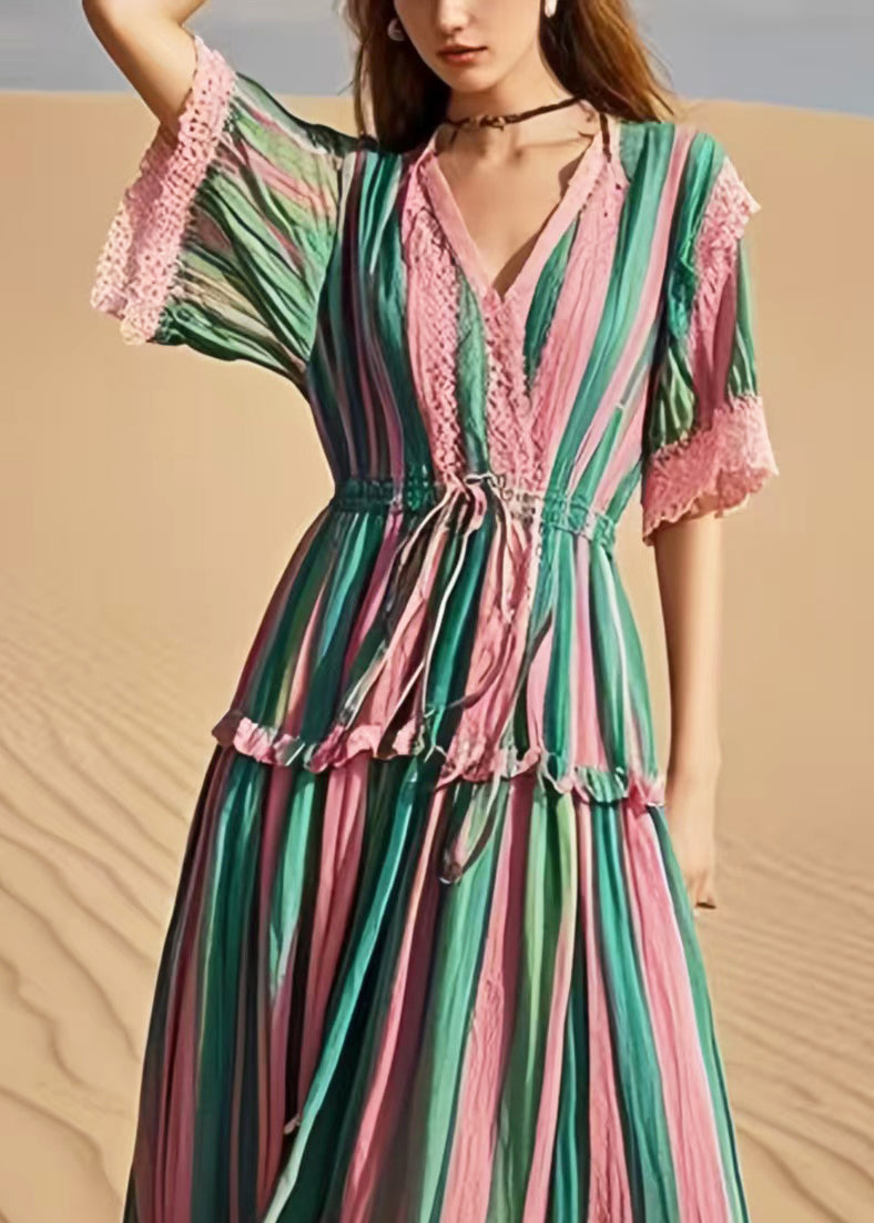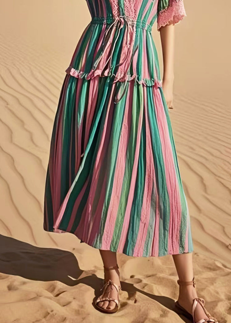 Women Rainbow Cinched Striped Cotton Holiday Dress Summer