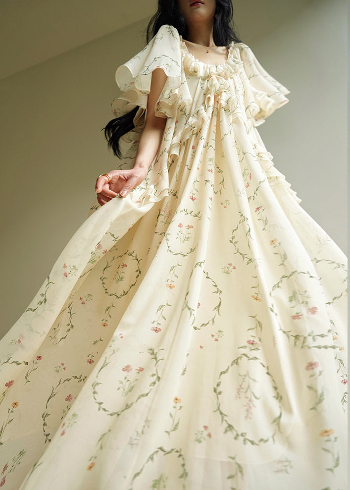 Organic Beige O-Neck Ruffled Patchwork Maxi Dress Short Sleeve