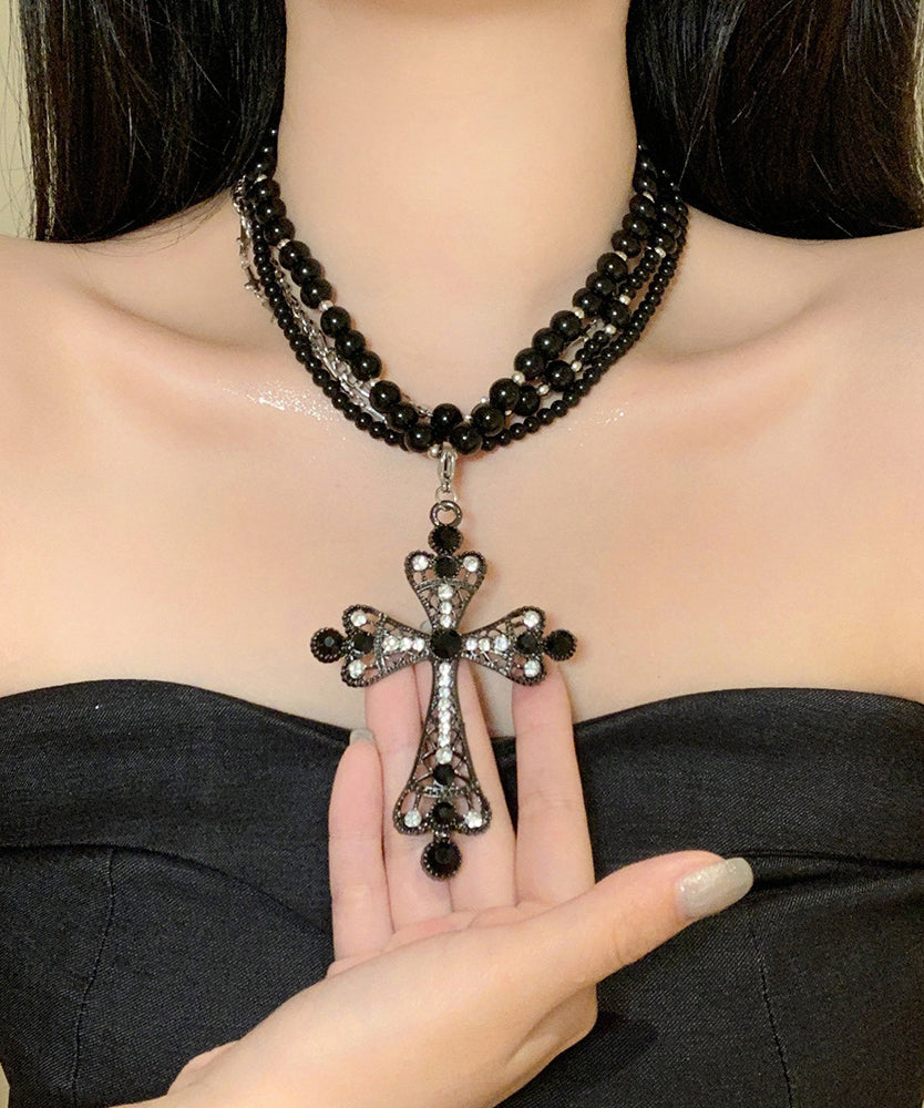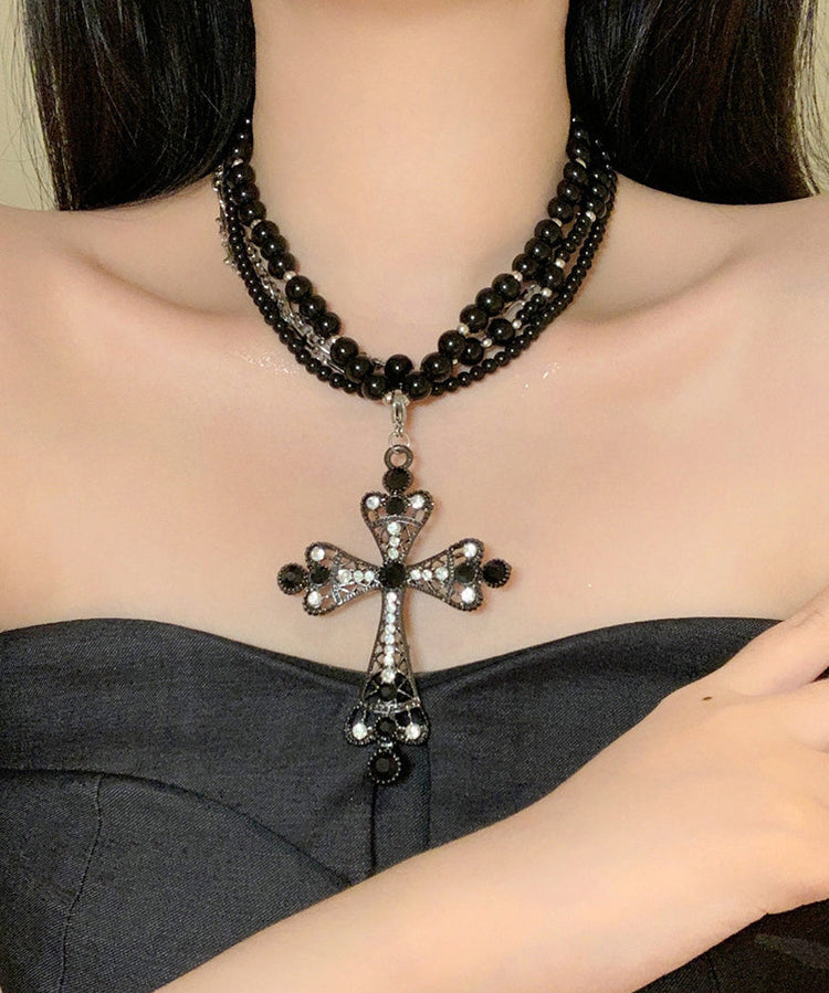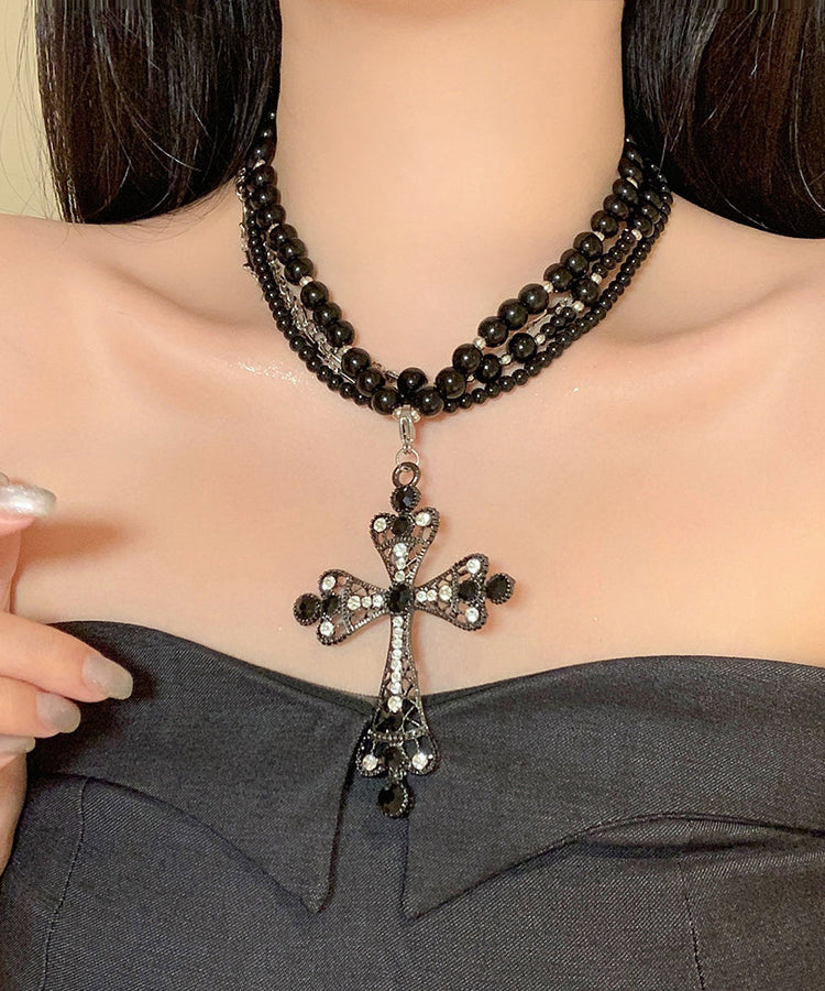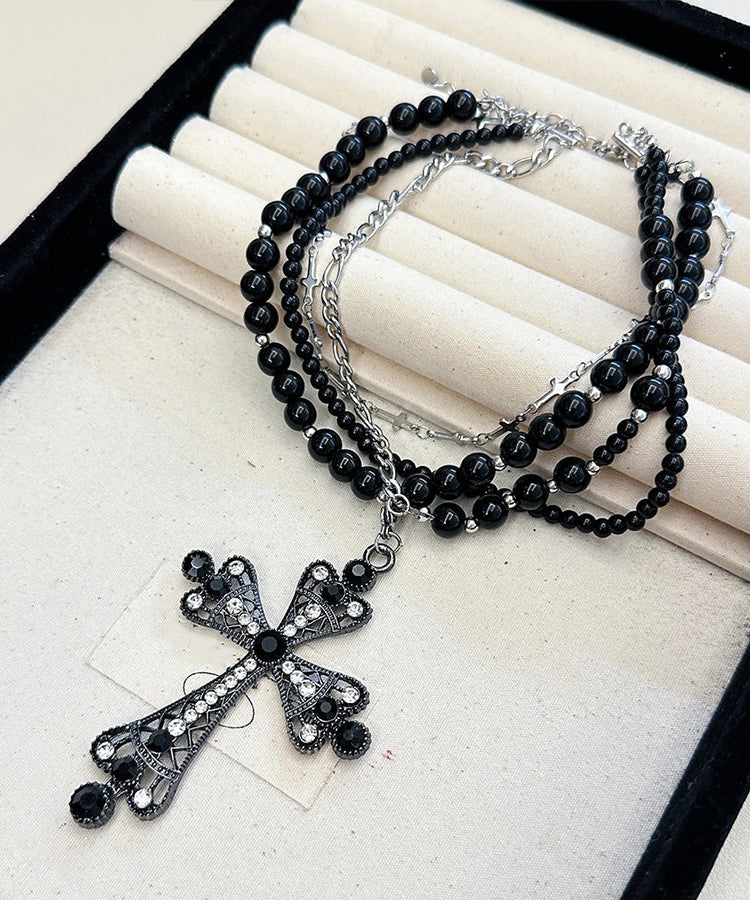 Chic Black Zircon Cross Multilayer Beads Gratuated Bead Necklace