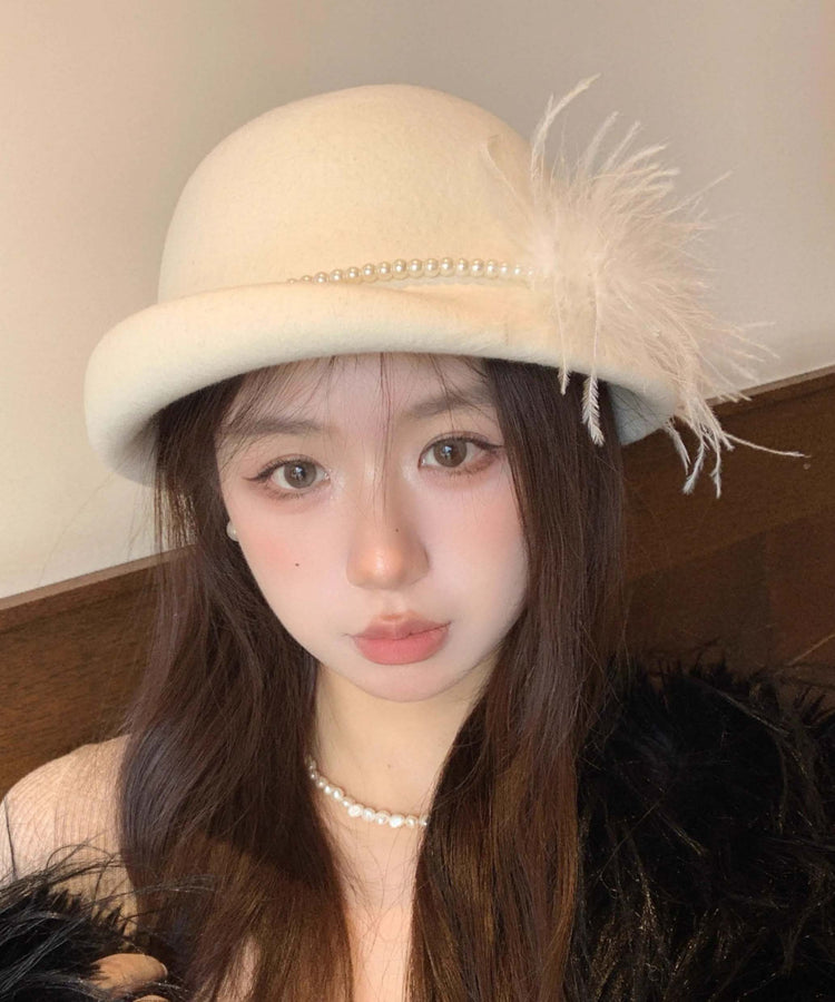 French Style White Nail Bead Feather Woolen Bucket Hat