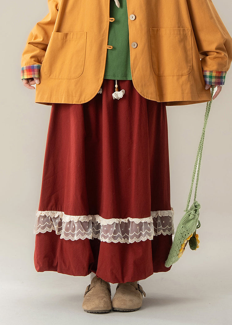 Simple Red Elastic Waist Patchwork Lace Holiday Skirt Spring