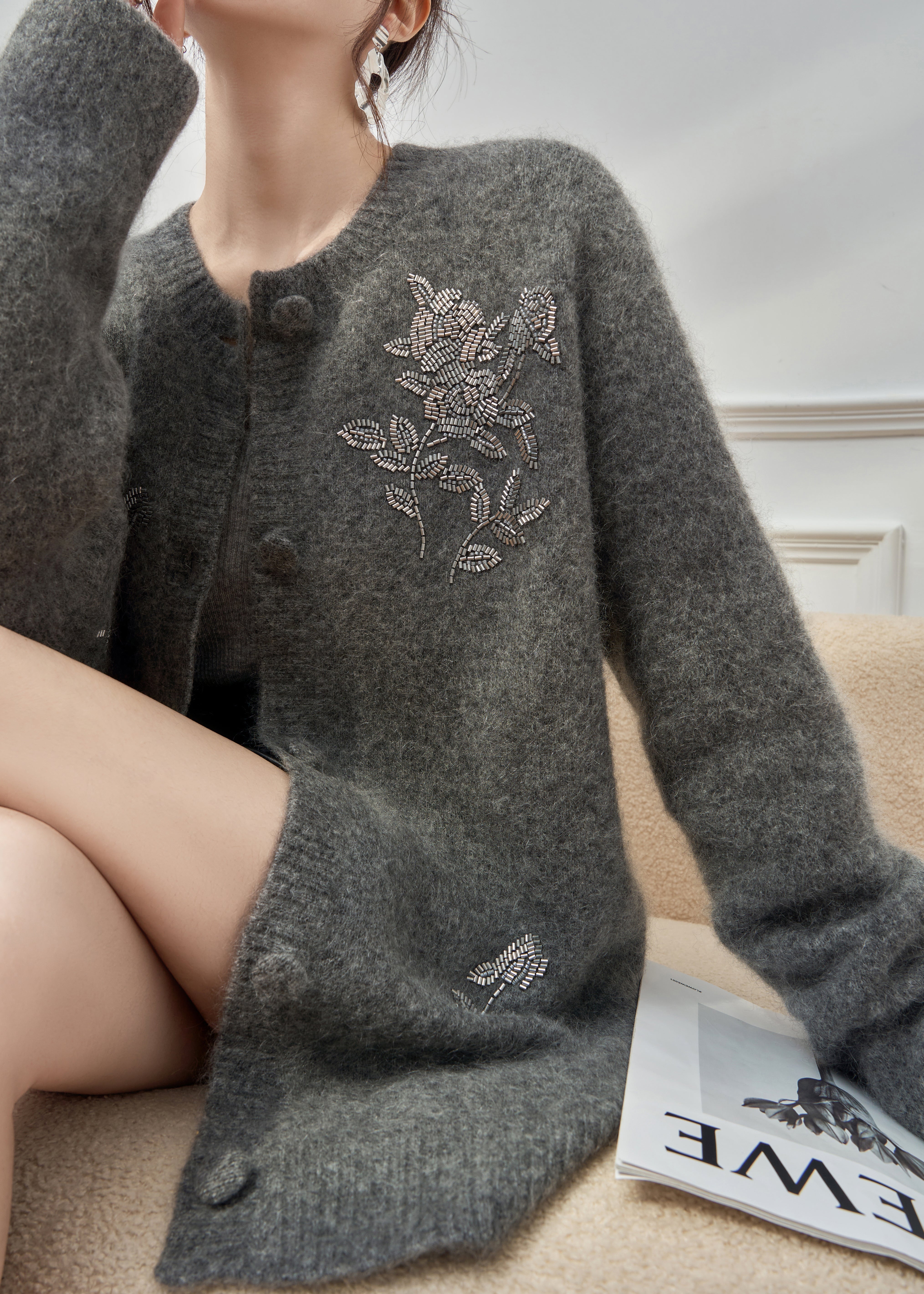 Original Grey O Neck Floral Pearl Knit Cardigan Winter