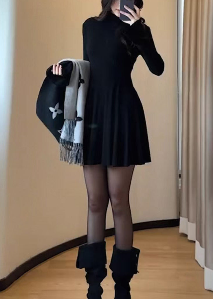 Cute Black Oversized Plaid Fine Cotton Filled Dresses Lantern Sleeve