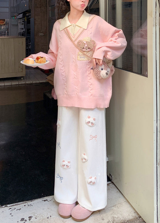Cute White Cat Decorated Embroidered Warm Fleece Pants Winter